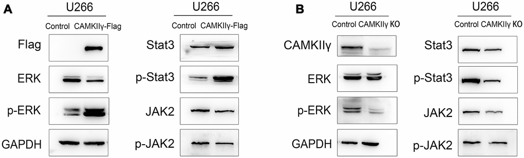 To test it, we first analyzed the levels of total and phosphorylated ERK, Stat3 and Jak2 in U266 cells with CAMKIIγ overexpression using Western blot. We observed that the levels of phosphorylated ERK and Stat3 were markedly increased, but total levels of ERK and Stat3 did not alter as compared with controls (Figure 5A, 5B). We next analyzed the levels of total and phosphorylated ERK and Stat3 in U266 cells with CAMKIIγ knock-down using western blot. We found that knockdown of CAMKIIγ reduced the levels of phosphorylated ERK and Stat3, but not total levels of ERK and Stat3. These results suggest CAMKIIγ plays critical roles in maintaining the activation of MAPK/ERK and JAK2/STAT3 signaling pathways of MM.