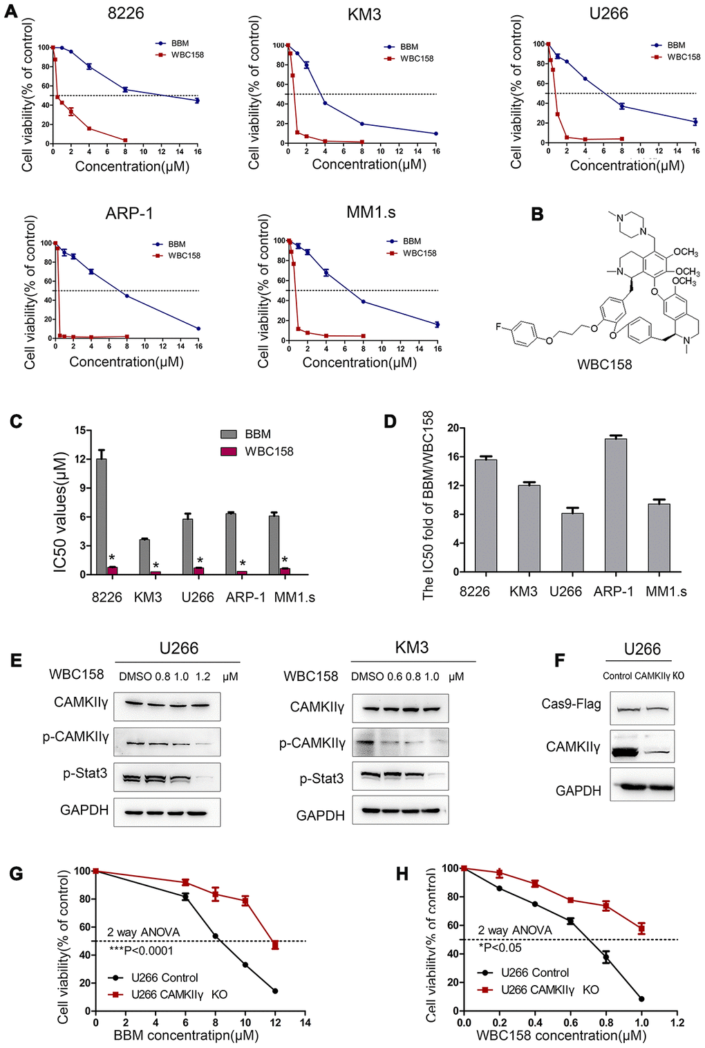 Next, we performed Western blot and MTT assay to determine whether WBC158 inhibited the growth of MM cells partially by targeting CAMKIIγ. First, we treated U266 and KM3 cells with different concentrations of WBC158 for 72h. We found that the levels of activated CAMKIIγ (p-CAMKIIγ) and p-Stat3 but not total CAMKIIγ in both U266 and KM3 cells decreased in dose-dependent manners. (Figure 6E). To confirm whether CAMKIIγ is an important target of BBM and WBC158, we performed CAMKIIγ-knockout (CAMKIIγ-KO) in U266 cells (Figure 6F), and then determined effect of BBM and WBC158 on viability of U266 cells. We observed that CAMKIIγ-KO conferred 1.44-fold and 1.55-fold decreases, respectively, in sensitivity to BBM and WBC158 (Figure 6G and 6H). These results strongly suggest a direct relationship of CAMKIIγ levels with BBM and WBC158 response.