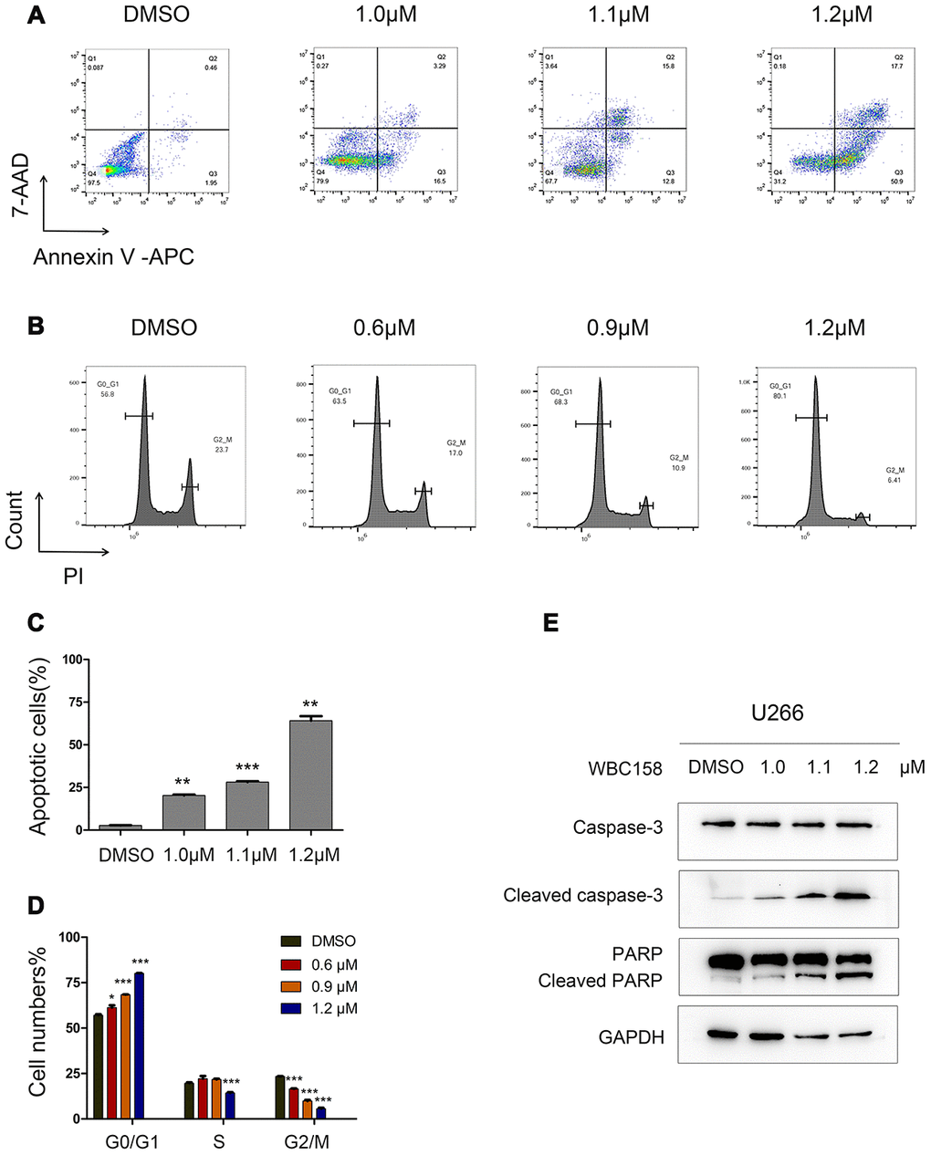 To detect whether WBC158 played a role in apoptosis and cell cycle of MM cells, we treated U266 cells with WBC158 at different concentrations for 24h. As a consequence, WBC158 potently induced apoptosis (Figure 7A, 7C) and suppressed cell cycle progression (Figure 7B, 7D). Consistent with these results, apoptosis-associated protein cleaved-Caspase 3 and cleaved-PARP increased in dose-dependent manners in U266 cells after treatment with WBC158 for 24h (Figure 7E). Cell cycle analysis showed WBC158 treatment resulted in increased of G0/1 cells and decreases of S and G2/M cells in U266 cells (Figure 7D). These results indicate that WBC158 is new potent agent that induces apoptosis of MM cells through targeting CAMKIIγ.