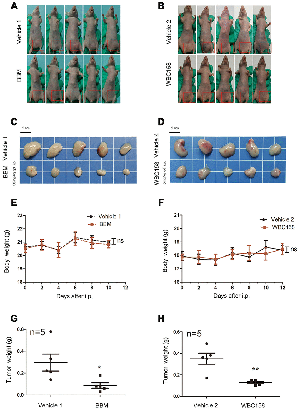 BBM and Citric acid (DAMAO, China) in equimolar amounts were dissolved in PBS (TBD, China) at a concentration of 5mg/ml, and WBC158 (Weben Pharmaceuticals) with the final concentration of 0.25 mg/ml. The vehicles had the same concentration of citric acid dissolved in PBS (vehicle 1, vehicle2). To evaluate the role of BBM analogues in MM murine xenograft model, nude mice were injected subcutaneously in the left groin with 1.5x10^7 U266 cells in 0.2 mL PBS. When palpable tumors became detectable, approximately a week after injection of U266 cells, the mice were randomly divided into different groups to receive vehicles (Control groups), BBM (50 mg/kg, BBM group) or WBC158 (5 mg/kg, WBC158 group) treatment via intraperitoneal injection once a day for nearly 12 consecutive days, respectively. We defined the first day of treatment as Day 0 and started to record body weight every other day.