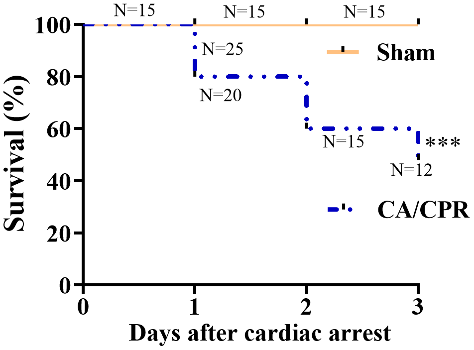 As shown in Figure 2, all 15 mice survived in the sham group on day 3 after sham procedures. Besides, 20, 15 and 12 of 25 mice survived in the CA/CPR group on day 1, 2 and 3 after CA/CPR procedures, respectively. The survival rates were 80%, 60%, and 48%, respectively, which was similar to previously published literature [17, 18]. In our settings, the mice received five minutes of CA, and subsequent CPR performance exhibited a remarkable abnormality in cognitive function (Figure 1E).