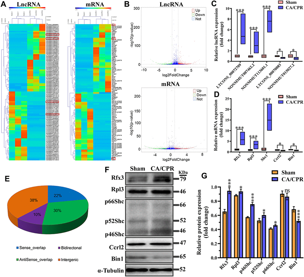 To identify novel therapeutic targets for CA/CPR induced cognitive impairment, we applied high-throughput RNA-seq analysis to profile lncRNAs and mRNAs with differentially expressed in the hippocampus of the two groups. Our results showed that in comparison with the sham group, 1920 lncRNAs were differentially expressed in the CA/CPR group, among which 719 were down-regulated, and 1201 were up-regulated; 1162 mRNAs were differentially expressed, among which 480 were down-regulated, and 682 were up-regulated. All of the differentially expressed mRNAs and lncRNAs were shown in the Supplementary Table 1. One hundred lncRNAs and mRNAs with the most significant difference were extracted for clustering analysis between the two groups (Figure 3A). The volcano plots were constructed to reveal systematic variations for lncRNAs and mRNAs expression between CA/CPR and sham groups (Figure 3B). Among these lncRNAs and mRNAs, five pairs of lncRNAs and mRNAs were chosen for further validation by qRT-PCR in an additional 10 pairs of hippocampal tissues from the two groups. The expression levels of lncRNA LTCONS_00072709, NONMMUT113601.1, and NONMMUT007462.2 were up-regulated, while NONMMUT015027.2 and LTCONS_00070083 were down-regulated (Figure 3C). For mRNAs levels, Ccrl2 and Bin1 were down-regulated, while Rfx3, Shc1, and Rpl3 were up-regulated (Figure 3D). The results were consistent between the RNA-seq analysis and qRT-PCR analysis, suggesting the reliability of our RNA-seq data. In addition, structurally different RNAs exhibit diverse mechanisms that lead to different regulatory outcomes. We classified the differentially expressed lncRNAs into four categories (bidirectional, intergenic, antisense, and sense overlap) (Figure 3E). Our data indicated that among these lncRNAs, the intergenic lncRNA category accounted for about 40%, many of which were conserved and functional across mammalian species [19]. The lncRNA and mRNA raw data can be accessed at NCBI SRA (BioProject ID: PRJNA517595).