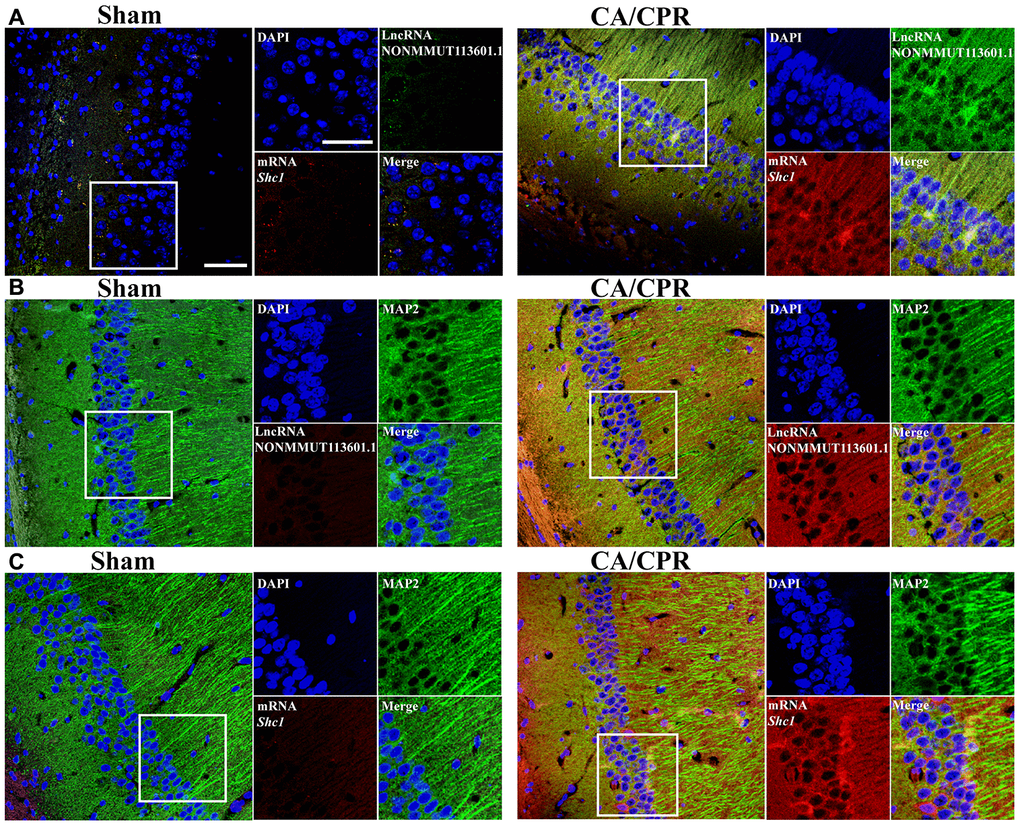 Brain tissues of CA/CPR and sham mice were dissected and fixed in 4% paraformaldehyde solution for 48 h, followed by embedded in paraffin. Paraformaldehyde brains were sectioned at 10 μm thickness by a microtome. Paraffin slice samples were dewaxed by xylene (3 times, 5 min per time) and ethanol (100%, 85%, and 70% serial rehydration, 3 min), respectively. After being washed by PBS, the samples were processed by 0.2 M HCl for 20 min, 0.5% Triton for 20 min, 20 μg/mL Proteinase K for 20 min, and 3% hydrogen peroxide for 20 min. Each slide was rinsed five times in distilled water. After air-drying, the samples were incubated with biotin-labeled lncRNA NONMMUT113601.1 and digoxigenin-labeled Shc1 mRNA probes in hybridization buffer (1: 1: 50, v/v/v). After hybridization at 37 °C for 24 h, the unbound and excessive probes were removed by twice washes in 2 × saline sodium citrate (SSC) buffer for 5 min, followed by blocked in 3% BSA for 30 min at room temperature. Then the RNA probes were detected by anti-digoxigenin (sheep Ab, Merck, 11333089001) and anti-avidin (mouse mAb, Santa, sc51760), followed by labeled with FITC labeled anti-mouse IgG (Abcam, ab6724) and Alexa 647 labeled anti-sheep IgG (Abcam, ab150179). The unbound antibody was removed by washing the samples twice in 2 × SSC buffer for 5 min. Nuclei were dyed by DAPI before being observed on a laser confocal microscope (N-SIM S, Nikon, Japan).