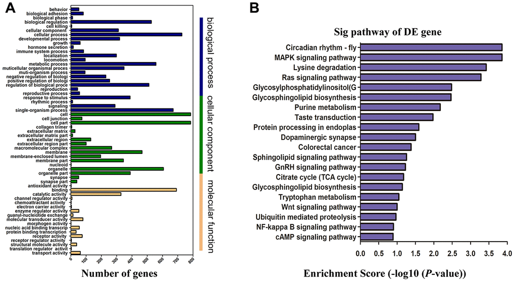 Functional enrichment analysis is a method for identifying enriched genes for molecular functions, biological processes, and pathways in the datasets of interest. Gene ontology (GO) database analysis (http://www.geneontology.org) was carried out to annotate genes in terms of biological processes, molecular functions, and cell components [44]. KEGG database (http://www.genome.jp/kegg/) analysis of the coding genes related to differentially expressed lncRNAs was also conducted by KOBAS software using a hypergeometric test [45]. GO terms or KEGG pathways with P-value<0.05 were regarded as significantly enriched. Benjamini-Hochberg correction with a false discovery rate was utilized for correcting the P-value.