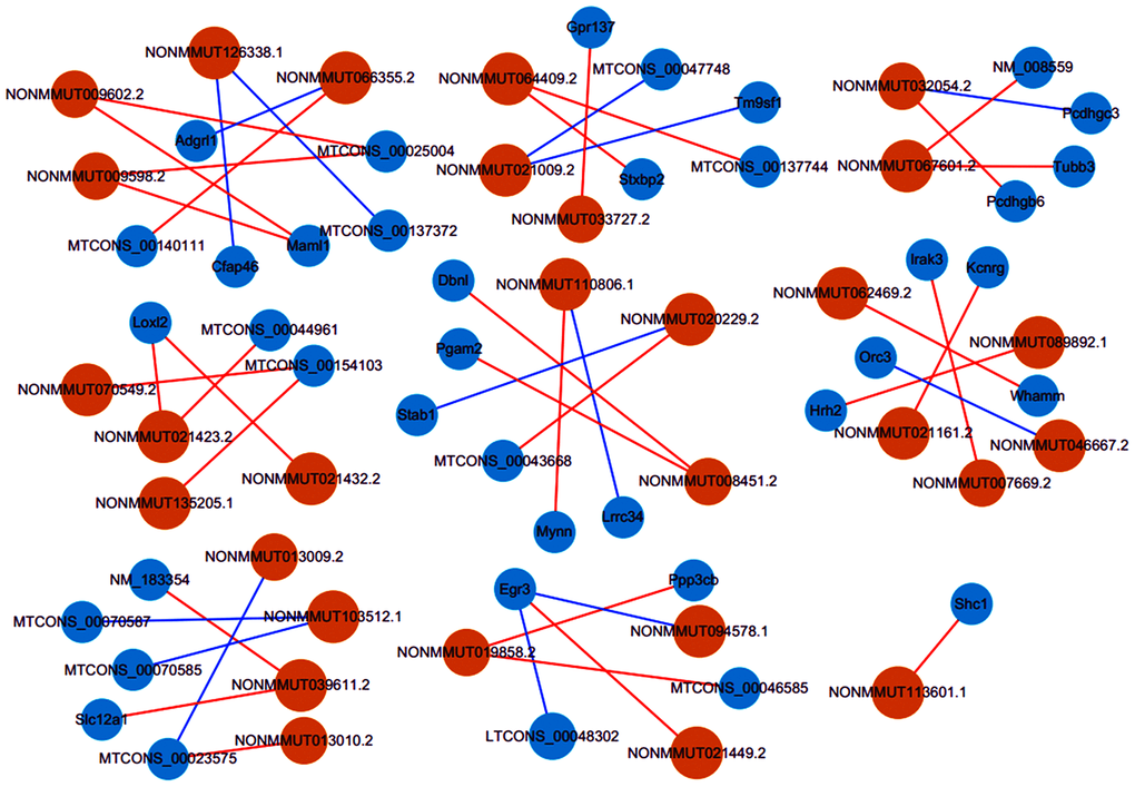 Pearson correlation coefficient (PCC) between the differentially expressed lncRNAs and mRNAs was calculated. LncRNAs and mRNAs with PCC > 0.90 or < -0.90, P < 0.01 were selected for drawing the networks of lncRNA-mRNA using the program Cytoscape [46].