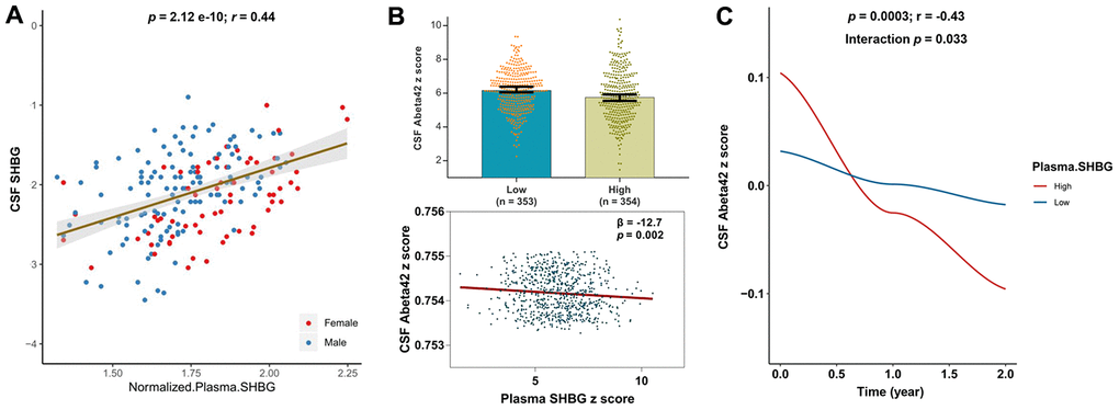 Data of SHBG levels both in plasma and in CSF were available for 188 subjects from ADNI-1. The correlation analysis showed that SHBG levels in plasma and CSF were highly related (p = 2.12 × 10 -10, r = 0.44) (Figure 1A).