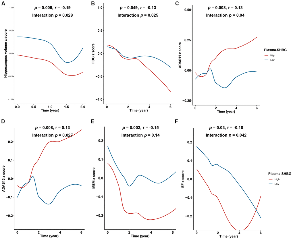 With the accumulation of biomarker and imaging abnormalities, cognitive impairments become the major manifestations as AD progresses. We found that higher plasma SHBG levels conferred a faster decline in general cognition (Figure 2C and 2D), memory function (Figure 2E), and executive function (Figure 2F). Sensitivity analyses excluding those who developed AD within one year since baseline or adding TT and FTI as covariates barely changed the results.
