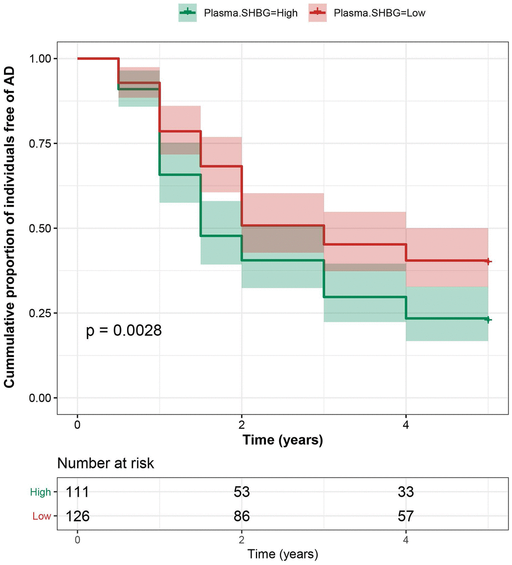 Finally, the influence of plasma SHBG on the risk of incident AD was explored using the time-dependent Cox proportional hazards models. The adjusted risk, expressed as hazard ratio (HR) and 95% confidence interval (CI), was estimated for the association between incident AD and plasma SHBG levels at baseline. Individuals who did not develop AD or who were lost to follow-up were censored at the time of their last evaluation. The dependent measure was time from entry into the cohort to AD diagnosis. To estimate the influence of those lost, the baseline characteristics of those lost to follow-up and those who completed the follow-up were compared. In the Cox proportional hazard models, three models were employed with or without covariates: 1) analyses were conducted without adjusted covariates; 2) we adjusted for age, gender, education, APOE4 status, and diagnosis; 3) we added diabetes mellitus type 2 (DM2), current depression, body mass index (BMI), hypertension, hyperlipidemia, sleep disorder, stroke history, cardiovascular disease (CVD), alcohol abuse, hearing loss, current smoker, and cancer as covariates.