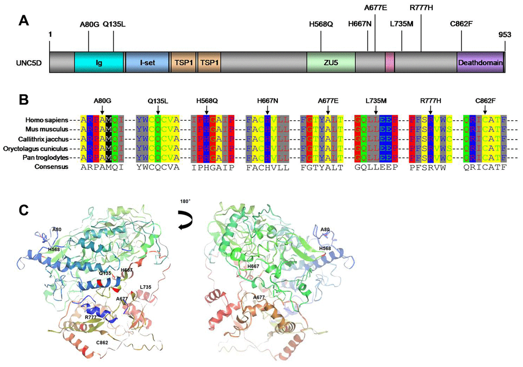 The UNC5D variants comprised eight novel somatic mutations. We utilized SIFT/PolyPhen to predict the functional alterations of these variants, as well as the others identified among the 27 candidate genes (Supplementary Table 5). The eight UNC5D variants were all missense mutations (Figures 1C and 2A). Moreover, Ortholog analysis indicated that these missense mutations were located at well-conserved amino acid positions across distinct species, suggesting that these mutations might influence protein function. We constructed the crystal structure of UNC5D by using I-TASSER from the Zhang lab (Figure 2C) [26]. The C862F mutation is located in the death domain of UNC5D, for which alterations have been shown to influence protein function and induce tumorigenesis [20].