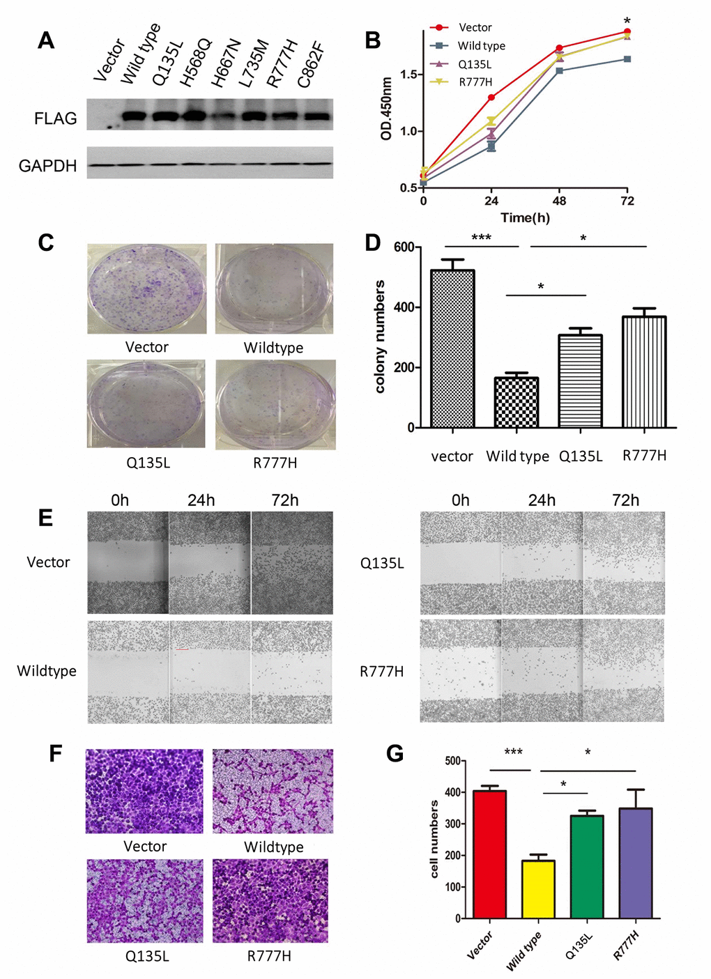 To clarify the function of UNC5D mutants, we analyzed the NCI-H1299 lung cancer cell line in vitro. Preliminary analyses demonstrated that this cell line does not express UNC5D transcripts or protein. We stably infected NCI-H1299 cells with virus harboring vectors encoding wild-type UNC5D (UNC5D-WT) or one of six UNC5D mutants (UNC5D-C862F, UNC5D-Q135L, UNC5D-H568Q, UNC5D-H667N, UNC5D-L735M, and UNC5D-R777H) or a control vector and performed Western blotting to verify that the proteins were overexpressed (Figure 3A). According to our preliminary experiment, Q135L and R777H were used to investigate the function of mutants. We next performed cell proliferation and colony formation assays and found that cell growth was inhibited by UNC5D-WT but not the mutant variants (Figure 3B–3D). Moreover, UNC5D-WT expression retarded wound closure in a scratch wound-healing assay (Figure 3E) and reduced the number of migrating cells by 2- to 3-fold in a Transwell assay (Figure 3F and 3G). These effects were not observed with overexpression of the UNC5D mutants. We further validated these effects in vivo using a nude mouse NCI-H1299 cell xenograft model. Consistent with the in vitro data, the growth of subcutis tumors expressing UNC5D-WT was inhibited (Supplementary Figure 3A), whereas tumors from cells overexpressing the UNC5D mutants had significantly larger tumor volumes (P < 0.05) that were similar to that of the vector control (Supplementary Figure 3B).