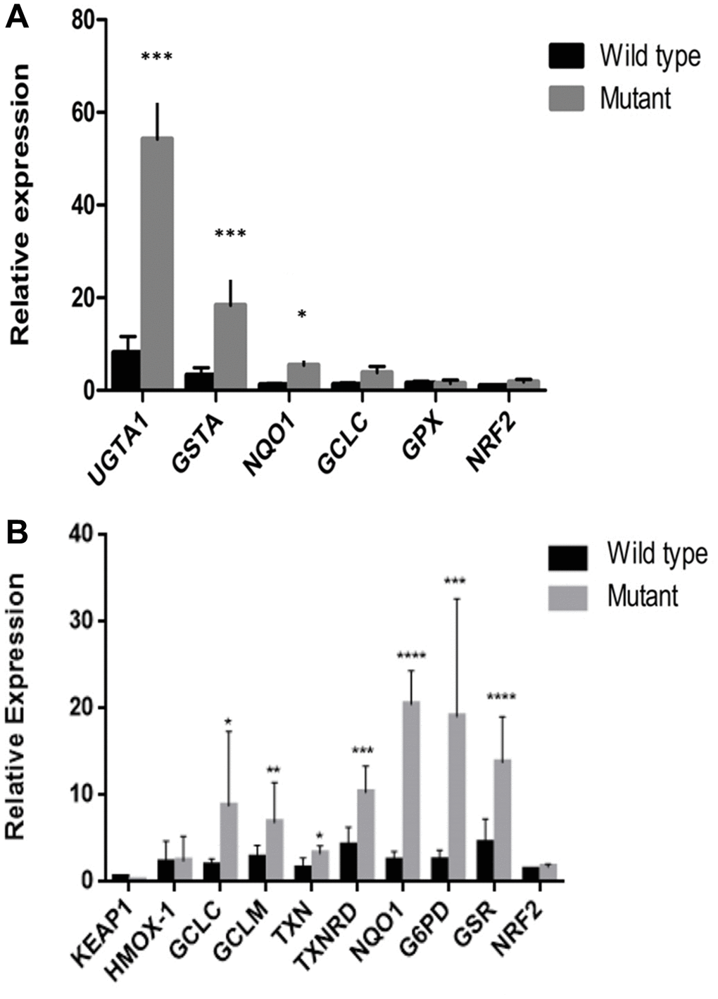 To investigate the impact of KEAP1 or NFE2L2 mutations in NSCLC, we compared the expression of known NFE2L2 target genes involved in oxidative stress in samples with (n = 9) or without (n = 18) either of these mutations. We found that samples with KEAP1 or NFE2L2 mutations had significantly increased expression of UGT1A1, GSTA, NQO1, GCLC, and GPX (Figure 4A). This increase was validated in vitro, where the expression levels of HMOX1, GCLC, GCLM, TXN, TXNRD, NQO1, G6PD, and GSR were higher in lung cancer cell lines with KEAP1/NFE2L2 mutations (i.e., cell lines A549, NCI-H460, and NCI-H838) than in those without mutations (i.e., cell lines NCI-H292, 95D, SPC-A1, and NCI-H1299) (Figure 4B). These findings suggest that there may be altered responses to oxidative stress in the tumors of patients with KEAP1/NFE2L2 mutations and may thus represent much-needed potential therapeutic targets for NSCLC.