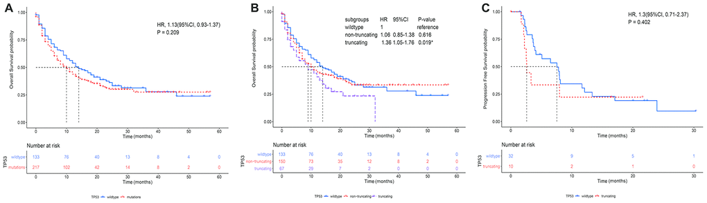 The flow chart of the study strategy is shown in Figure 1. The clinicopathological characteristics of the 350 metastatic or unresectable NSCLC patients from the Memorial Sloan Kettering Cancer Center Integrated Mutation Profiling of Actionable Cancer Targets (MSK-IMPACT) cohort who received anti PD-1/PD-L1 monotherapy (n=329) or a combination of anti-CTLA-4 and anti-PD-1/PD-L1 immunotherapies (n=21) is shown in Table 1. Kaplan-Meier survival curve analysis showed that the median overall survival (OS) of NSCLC patients with TP53 mutations (n=217) was 10 months compared to 14 months for patients with the wildtype TP53 (n = 133), but, the differences were not statistically significant [hazard ratio (HR) = 1.13, confidence interval (CI) = 0.93-1.37 and P = 0.209; Figure 2A]. Furthermore, the median OS of patients with TP53 truncating mutations (n=67) was significantly lower at 9 months compared to 14 months for patients with wildtype TP53 (n=133) as shown in Figure 2B (HR = 1.36, CI = 1.05-1.76; P = 0.019).