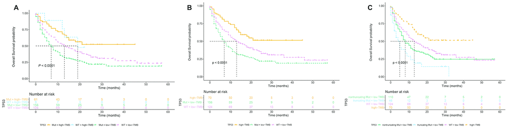 Next, we focused on the correlation between TP53 truncating mutations and the survival of NSCLC patients undergoing immunotherapies. Supplementary Table 1 shows the 55 truncating mutation sites in the TP53 gene from these patient samples. Multivariate Cox regression analysis showed that TP53 truncating mutations were an independent predictor of immunotherapeutic outcomes after the data was adjusted by age, sex, ICI regime and TMB (Table 2). Moreover, the stratification analysis results showed positive correlation between TP53 mutation status and TMB (P <0.001; Table 3). The mean TMB was 5.79, 12.14, and 12.92 for patients with wild-type TP53, non-truncating TP53 mutations, and truncating TP53 mutations, respectively. While high TMB favors survival [6, 8], TP53 mutations, especially truncating mutations reduce survival rates. Therefore, analysis of the association between OS and TP53 mutation status in low or high TMB NSCLC patient subgroups showed that patients with high TMB are associated with longer OS irrespective of the TP53 mutation status, however, the OS of patients with low TMB was significantly reduced by the TP53 mutation status (log-rank P < 0.0001; Figure 3A). We did not observe any differences in the OS of high TMB patients with or without TP53 mutation (log-rank P = 0.96; Supplementary Figure 1). Therefore, we merged the two subgroups of high TMB patients with or without TP53 mutations into one group and compared their survival status with the remaining two low TMB subgroups (with and without TP53 mutations). We observed that patients with low TMB and TP53 mutations showed significantly shorter median OS of 7 months compared to a median OS of 13 months for those with low TMB and wild-type TP53 (log-rank test, P < 0.0001; Figure 3B). Further stratification analysis demonstrated that the median OS for patients with truncating TP53 mutations and low TMB was significantly shorter compared to patients with TP53 non-truncating mutations and low TMB (5 months vs. 8 months; log-rank test, P < 0.0001; Figure 3C). Multivariate Cox regression analysis adjusted for parameters such as age, sex, and ICI regimes showed that TP53 mutations were an independent factor that was associated with shorter OS (HR = 1.41, CI = 1.05-1.89 and P = 0.023; Table 4) in patients with low TMB, especially those with truncating TP53 mutations (HR = 1.40, CI = 1.13-1.73 and P = 0.002; Table 4).