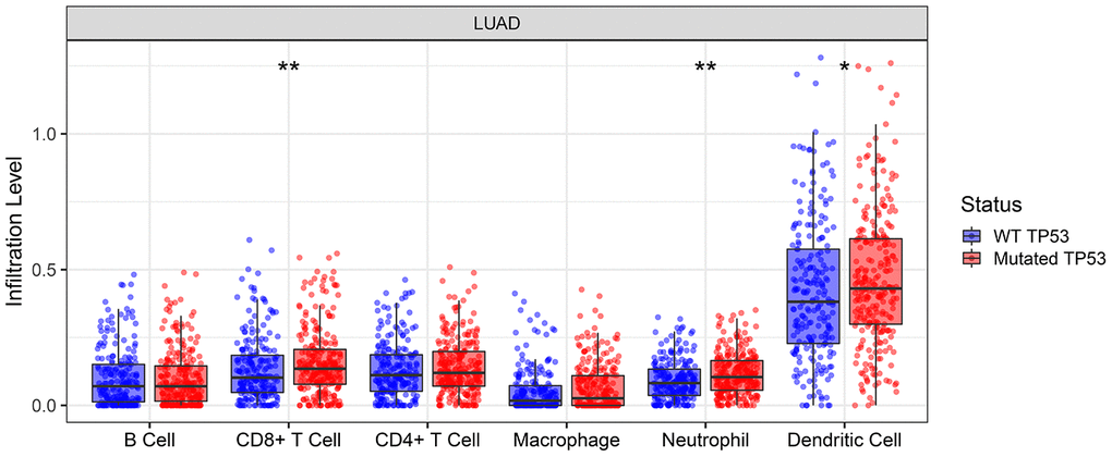 Tumor Immune Estimation Resource (TIMER) database analysis of lung adenocarcinoma samples showed that TP53 mutations were associated with significantly higher infiltration of CD8+ T cells, neutrophils and dendritic cells (Figure 4).