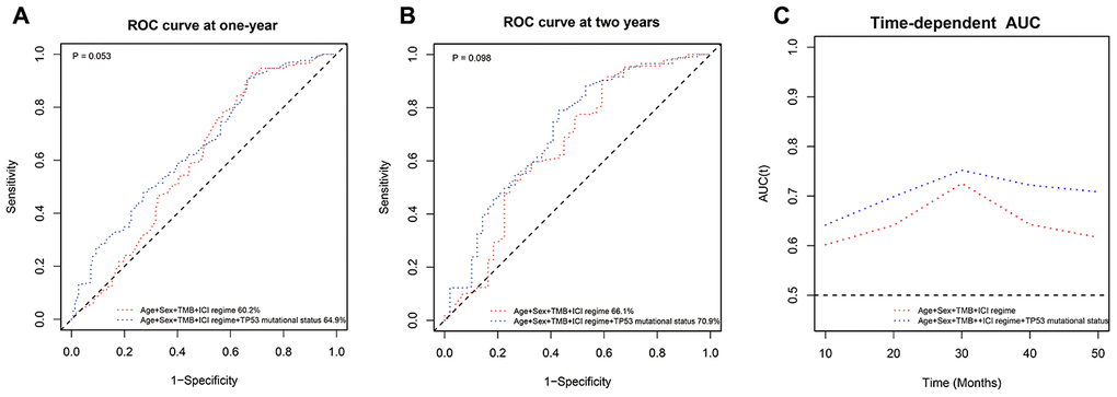 We investigated the prognostic prediction efficiency of the TP53 mutation status by constructing two prognostic models: (1) age, sex, ICI regime, and TMB; (2) age, sex, ICI regime, TMB and TP53 mutation status. Then, we generated ROC curves based on the one-year and 2-year survival data and also evaluated the time-dependent dynamic AUC of the two models.
