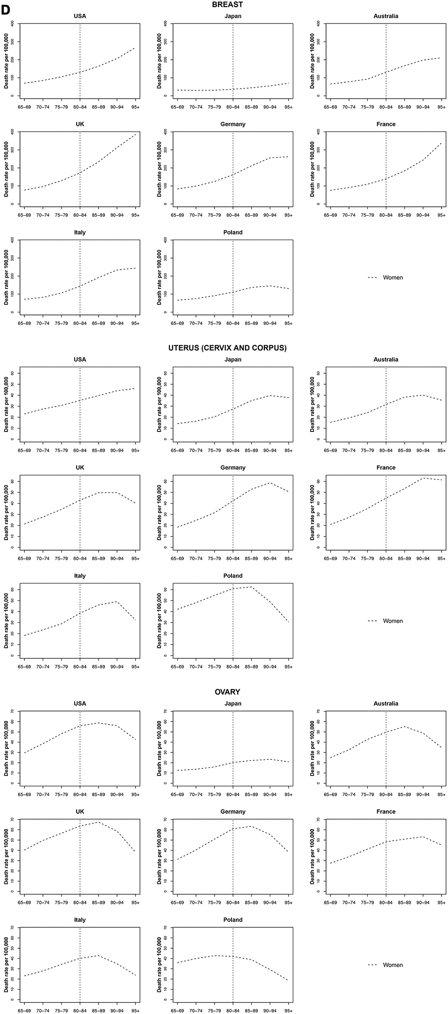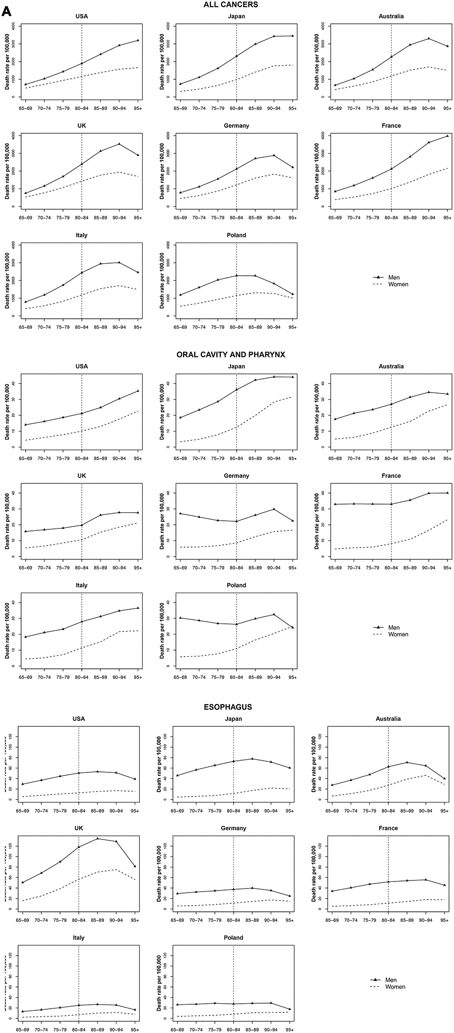 Cancer mortality in the selected countries for all cancers, for each major cancer site and both sexes are displayed in Figure 1-6. In Australia, the UK, Germany, and Italy, overall cancer mortality decreased after a peak age of 90 to 94 for both sexes. Trends in Poland started to decline earlier and showed a lower peak cancer mortality for both men (2273.45 per 100,000) and women (1314.07 per 100,000) compared to other countries. Cancer mortality continued to increase in the USA and France, and stabilized in Japan. Mortality rates are displayed in Supplementary Table 1.