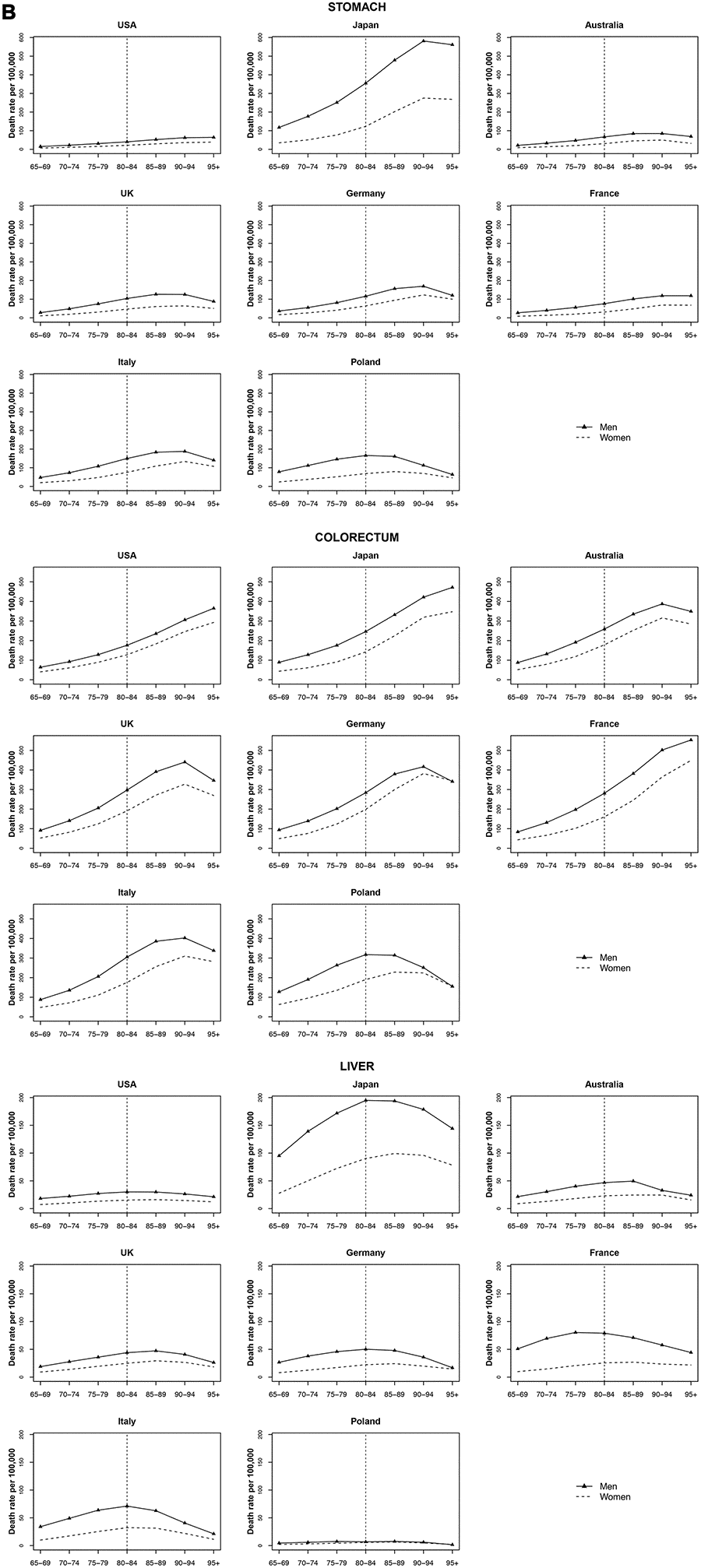 Stomach cancer reached a peak at age 90 to 94 and then stabilized or decelerated for both men and women in most countries. Japan had the highest increase of stomach cancer mortality with age (AAPC 31.1% for men and 49.9% for women). Colorectal cancer reached a peak at age 90 to 94 years and stabilized or decelerated in most countries, too, except for the USA, Japan, and France that continued to increase with age (Figure 2).