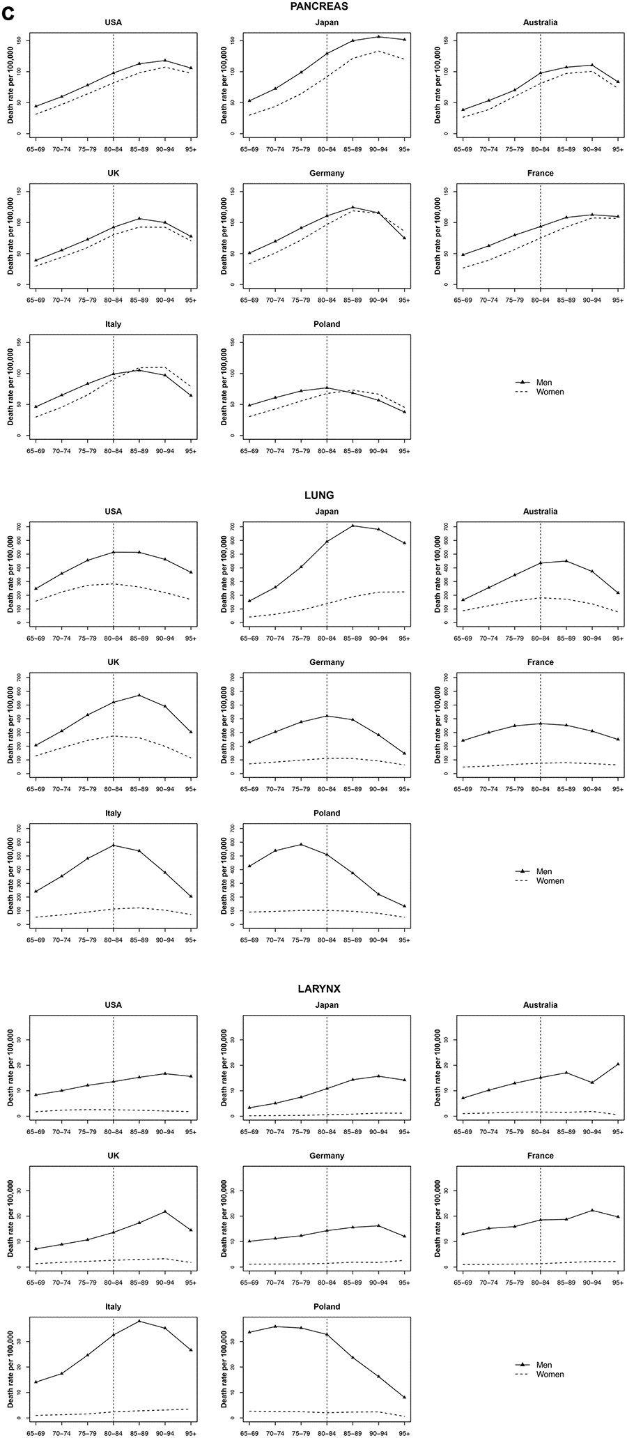 Among both men and women, lung cancer mortality in Australia, UK, Germany, and Italy reached a peak at age 80 to 89 (75-79 for Poland) and then decreased. At age 85-89, Japan showed the highest mortality rate of lung cancer, around 707.1 per 100 000 for men, while in women trend continued to increase with age, reaching a rate over 224.6 per 100 000 in over 95. Similar trends were found for laryngeal cancer, with however later peaks (Figure 3).