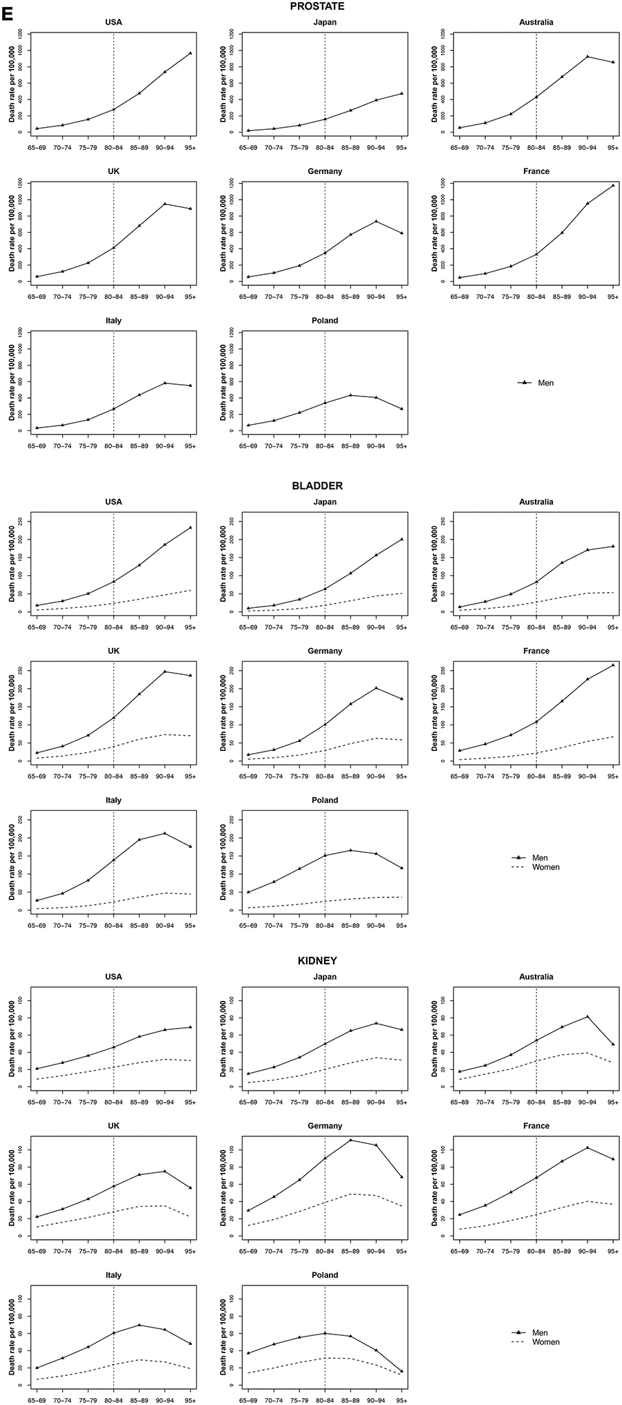 Among very old men, prostate cancer mortality rates were lowest in Japan and Poland. A large increase in mortality rate was observed between ages 85 to 95+ in the USA, in Japan and France. The increase in all other countries was not significant among these age groups (Figure 5).
