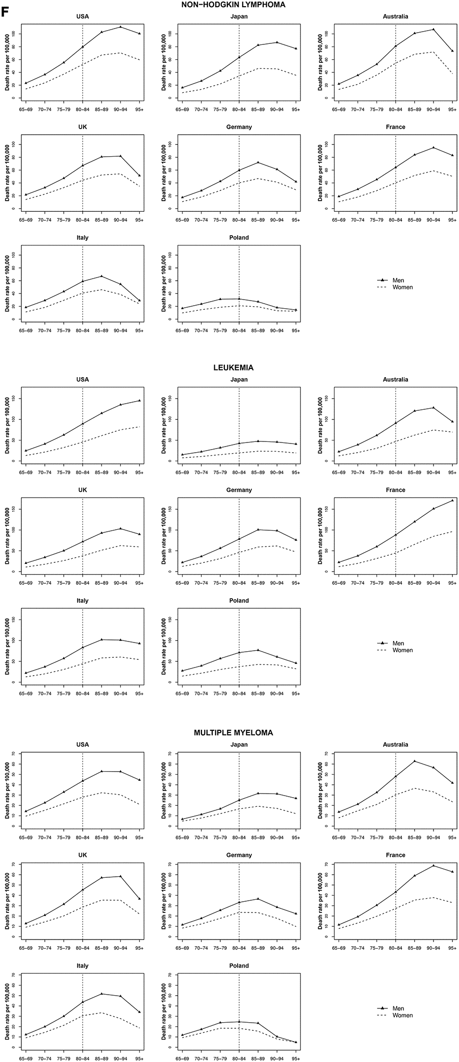 Mortality rate trends for non-Hodgkin lymphoma, multiple myeloma, and leukemia were similar among both men and women by age group. For Non-Hodgkin lymphoma and multiple myeloma, an increase was observed for most countries, until a peak at 85 years old, followed by a decrease. Leukemia mortality rates peaked at age 90 years in Australia and the UK; mortality rates increases occured earlier in Japan, Germany, Italy and Poland, followed by a decrease. In the USA and France, leukemia mortality rates increased for those over 90 years old (Figure 6).