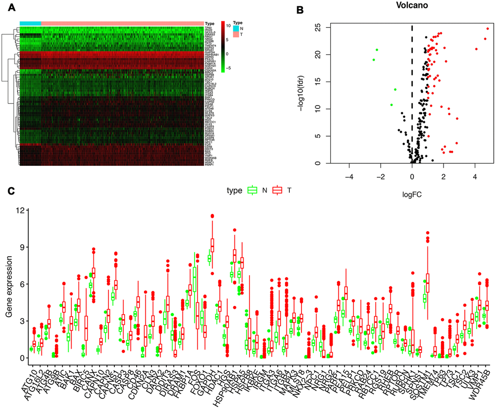 RNA-seq and clinical data from 23126 HCC tissue samples and 3038 non-tumor samples were downloaded from TCGA. 369 patients in total with primary HCC who were followed for more than 1 month were included in the study. The expression values of 232 ARGs were extracted. Considering the criteria for FDR <0.05 and [log2 (fold change)]> 1, we finally obtained 62 up-regulated ARGs (Figure 1A, 1B). A box plot was generated showing the expression pattern of 62 differentially expressed ARGs between HCC and non-tumor tissue (Figure 1C). Scatter plot showing expression patterns of 62 up-regulated genes.