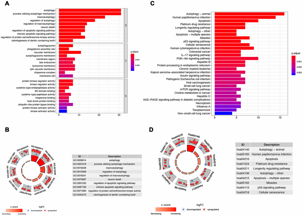 Functional enrichment analysis of 62 differentially expressed ARGs provides a biological understanding of these genes. Top 30 of GO enrichment and top 30 of pathway enrichment are summarized in Figure 2. GO and KEGG analyses revealed that the ARGs were mainly involved in autophagy, apoptotic signaling pathway, regulation of protein serine/threonine kinase activity, PI3K-Akt signaling pathway, and p53 signaling pathway (Figure 2A–2D).
