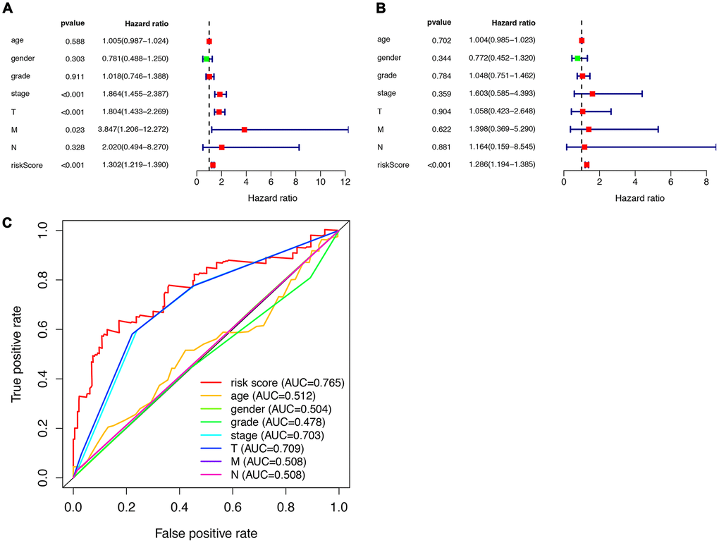 The package of “survival ROC” built-in R was utilized to generate the receiver operating characteristic (ROC) curve and calculate the area under the ROC curve (AUC) for each dataset to measure the prognostic role of the model.
