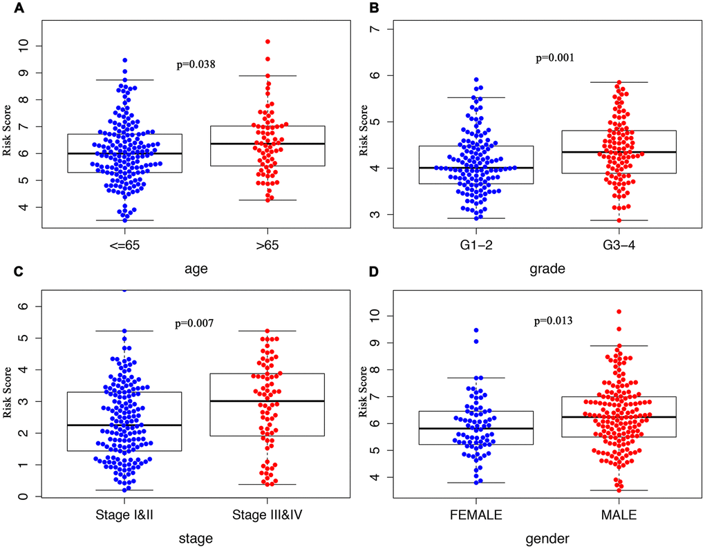 The clinical significance of the signature was assessed by analyzing its correlation with the clinical parameters, which suggested significantly increased risk score in patients who were older than 65 (Figure 5A), in Grade III/IV tumor differentiation (Figure 5B), in TNM stage III/IV (Figure 5C), or males (Figure 5D).