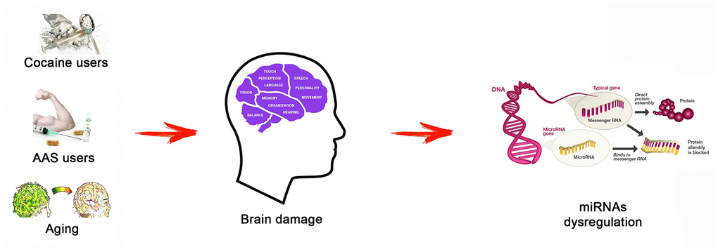 In this scenario, this experimental study aimed to analyze the role of several microRNAs (miRNAs) in brain damage after AAS misuse, to better understand the underlying mechanisms. Considering that previous studies have demonstrated that specific miRNAs (miR-21, miR-34, miR-124, miR-132, and miR-144) play a pivotal role in the control of important target genes involved both in neuronal apoptosis and neuronal stress-induced adaptation [32–37], the research hypothesis at the base of this experimental study was that the chronic use of AASs may be associated to brain damage with a dysregulation of these miRNAs. Moreover, miRNA expression values were compared among three different groups, “AAS” group, “Cocaine” group and “Aging” group, in order to define if AAS brain damage can be compared with the brain impairment linked to aging and/or cocaine assumption (Figure 1).