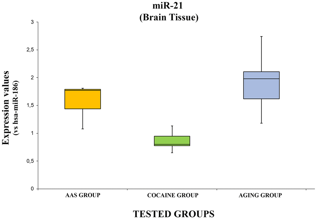 There were statistically significant differences among groups as determined by one-way ANOVA [F(2.18) = 3.55, p = <0.05(0.0001)]. Moreover, the expression level of hsa-miR-21-5p was significantly higher in the “AAS” group compared with the “Cocaine” group [F (1.12) = 4.74, p = <0.05 (0.00013)], while no statistical differences were noted comparing the “AAS” group with the “Aging” group [F (1.12) = 4.74, p = >0.05(0.18)]. Finally, the expression values of this miRNA were significantly higher in the “Aging” group compared with the “Cocaine” group [F(1.12) = 4.74, p = <0.05 (0.0002)].