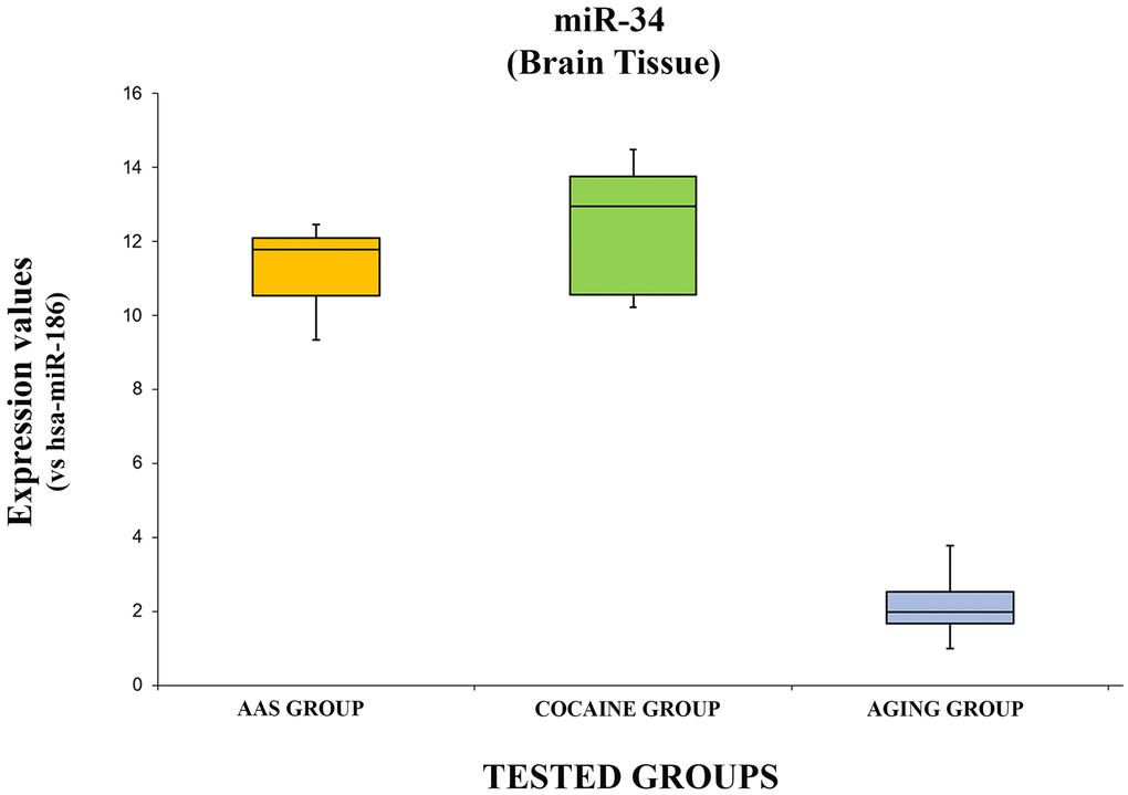 There were statistically significant differences among the groups as determined by one-way ANOVA [F(2.18) = 3.55, p = <0.05(5.74x10-11)]. Moreover, the expression level of hsa-miR-34a-5p was significantly higher in the “AAS” group compared with the “Aging” group [F (1.12) = 4.74, p = <0.05 (2.14x10-9)], while no statistical differences were noted comparing the “AAS” group with the “Cocaine” group [F (1.12) = 4.74, p = >0.05(0.22)]. Finally, the expression values of this miRNA were significantly higher in the “Cocaine” group compared with the “Aging” group [F(1.12) = 4.74, p = <0.05 (1.86x10-8)].