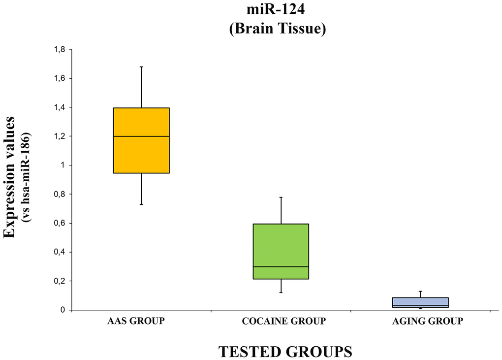 There were statistically significant differences among groups as determined by one-way ANOVA [F(2.18) = 3.55, p = <0.05(4.37x10-7)]. Moreover, the expression level of hsa-miR-124-5p was significantly higher in the “AAS” group both compared with the “Aging” group [F (1.12) = 4.74, p = <0.05 (2.08x10-6)] and with the “Cocaine” group [F (1.12) = 4.74, p = >0.05(0.0004)]. Finally, the expression values of this miRNA were significantly higher in the “Cocaine” group compared with the “Aging” group [F(1.12) = 4.74, p = <0.05 (0.004)].