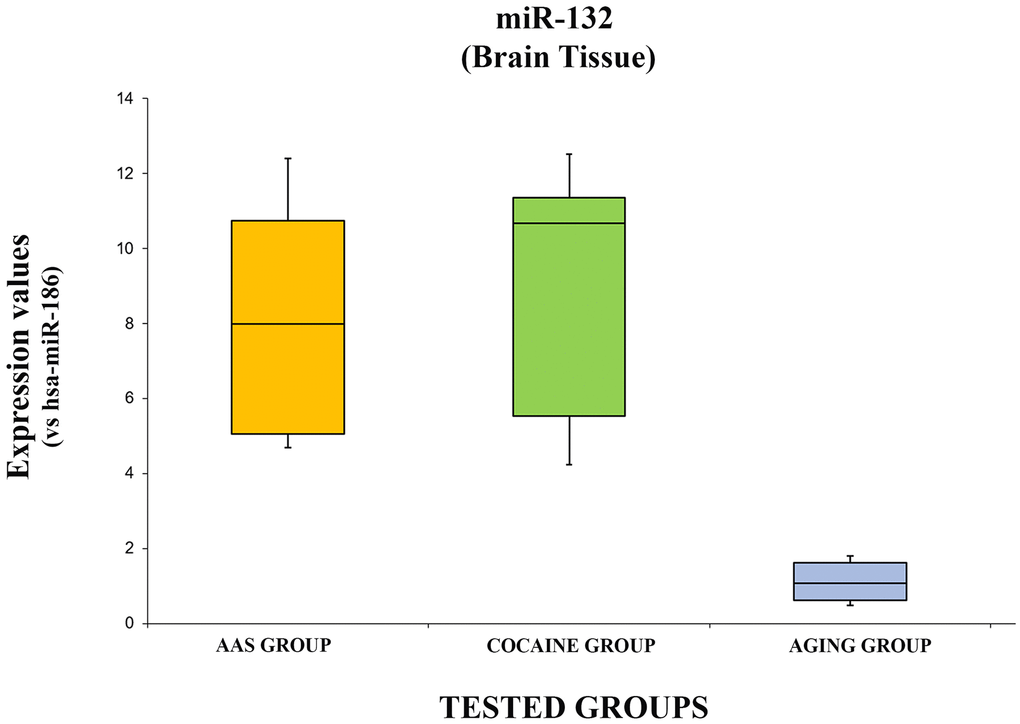 There were statistically significant differences among groups as determined by one-way ANOVA [F(2.18) = 3.55, p = <0.05(0.0001)]. Moreover, the expression level of hsa-miR-132-3p was significantly higher in the “AAS” group compared with the “Aging” group [F (1.12) = 4.74, p = <0.05 (0.0001)], while no statistical differences were reported compared with the “Cocaine” group [F (1.12) = 4.74, p = >0.05(0.73)]. Finally, the expression values of this miRNA were significantly higher in the “Cocaine” group compared with the “Aging” group [F(1.12) = 4.74, p = <0.05 (0.0001)].