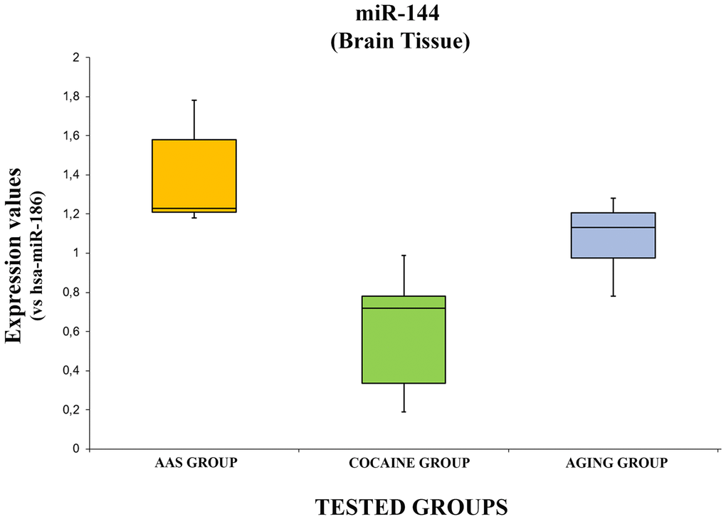 There were statistically significant differences among groups as determined by one-way ANOVA [F(2.18) = 3.55, p = <0.05(10x4.93-5)]. Moreover, comparing the expression level of the hsa-miR-144-3p singularly, it was significantly higher in the “AAS” group compared both with the “Cocaine” [F (1.12) = 4.74, p = <0.05 (0.0001)] and the “Aging” groups [F (1.12) = 4.74, p = <0.05(0.01)]. Moreover, the expression values of this miRNA in the “Aging” group was significantly higher compared with the “Cocaine” group [F(1.12) = 4.74, p = <0.05 (0.003)].