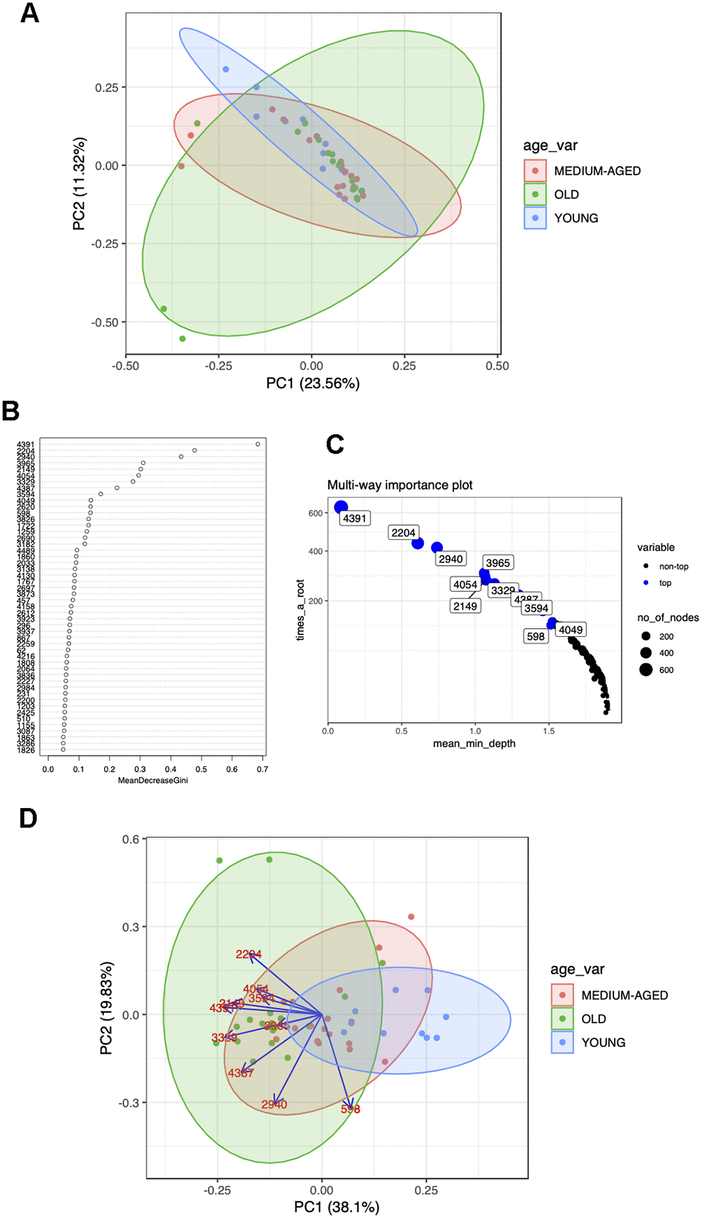 The impact of metabolite selection using RF is seen in Figure 1. Prior to application of RF there is a similar level of variability in samples across the age groups, and no distinct clustering of the groups (Figure 1A). After application of RF we were able to identify metabolites that can separate the full cohort age class (Figure 1B, 1C) and plotting principle components demonstrates a gradient effect across age groups in PC1 (old to young over PC1) (Figure 1D). This is the pattern we would expect to see if these metabolites are informative on age across the age-span of the study. The arrows in Figure 1D show loadings which represent the weight of the labelled variables in the direction of older age. Thus RF was able to select potentially informative metabolites for further analysis. Figure 1E shows representative boxplots for potentially informative metabolite levels in the polar positive modality. The abundance of each metabolite across the classes reflects the direction of the arrows in the biplot (see Figure 1D) highlighting the potential differences between age groups for these metabolite features. Clear differences observed between metabolite abundance for each age group. Although not our primary objective we also examined the ability of RF to classify subjects according to age group. RF performed well when predicting older age (OOB error for old between 0% (RP neg) and 11% (HILIC Pos)) when using the young as a reference group, due to younger age being harder to classify using RF (OOB ranging from 50-100% for young)