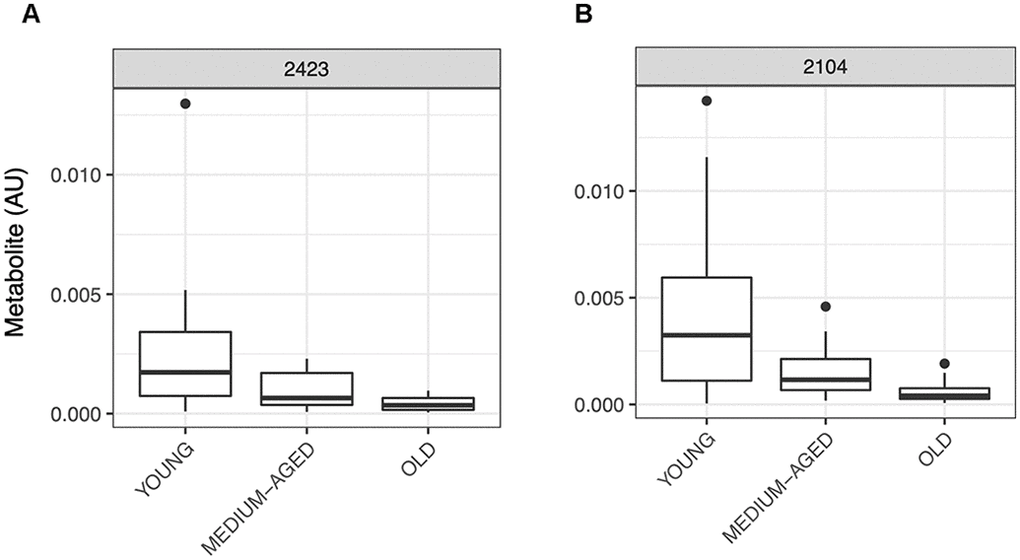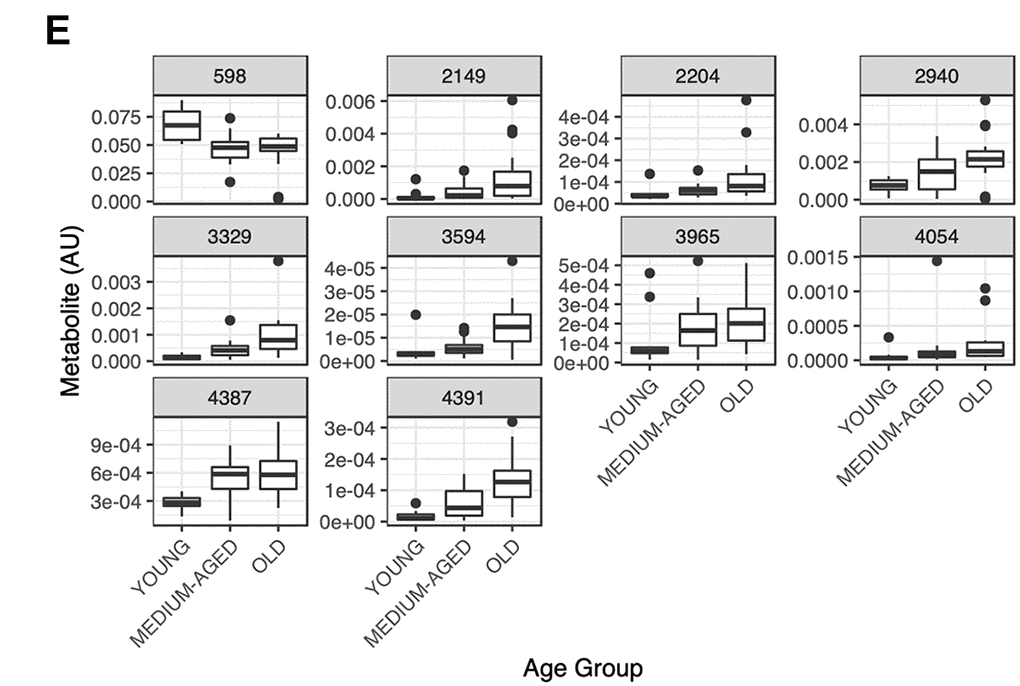 () Representative boxplots for RF selected metabolites showing differences in metabolite abundance across age groups for these variables.