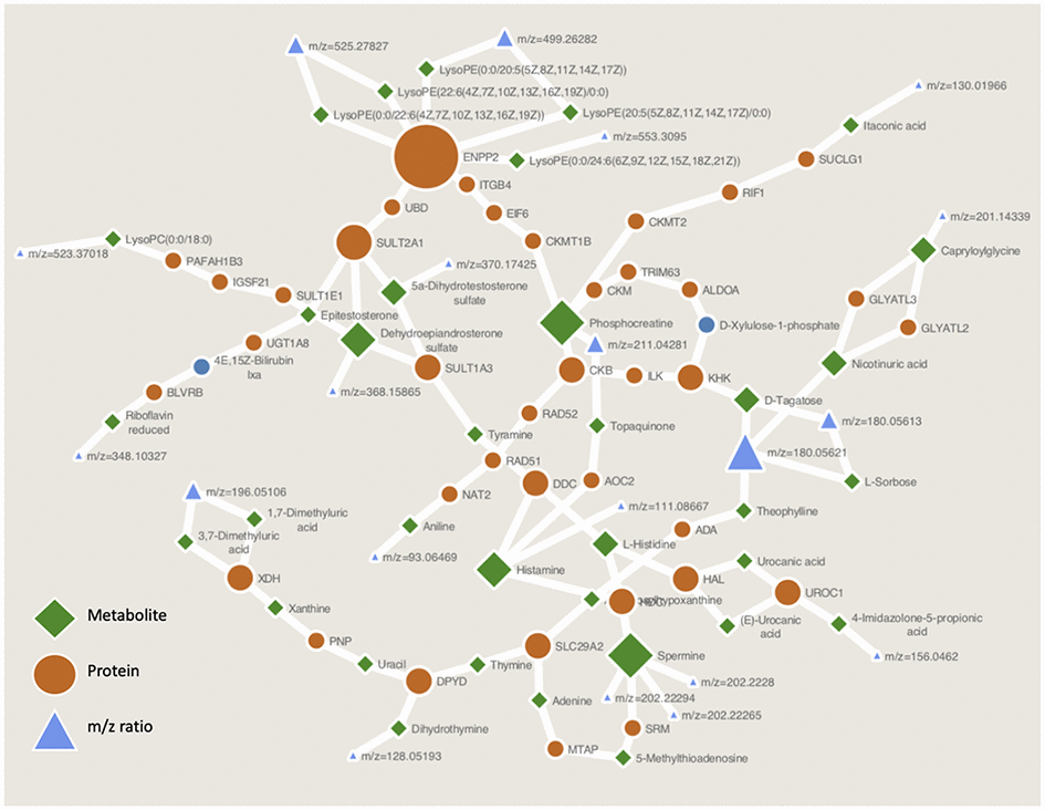 After metabolite identification (Supplementary Table 1), the PIUMet algorithm generates a metabolite network using the prize-collecting Steiner Forest algorithm, and identifies a subset of metabolites most likely to correspond to the matching metabolite feature, providing a robustness score for each in relation to the network parameters (see Pirhaji et al. [29] for more details). Using this method, we generated a metabolite network associated with human muscle ageing (Figure 3). This network highlights proposed links between identified metabolites including potential protein-metabolite and protein-protein interactions. Notably, subnetworks were generated around physiologically relevant hubs such as phosphocreatine, androgen metabolism, histamine and lysophospholipid metabolism (see Figure 3). These data indicate a potential role for these metabolites, or the subnetworks involved with these metabolites, in human muscle ageing.