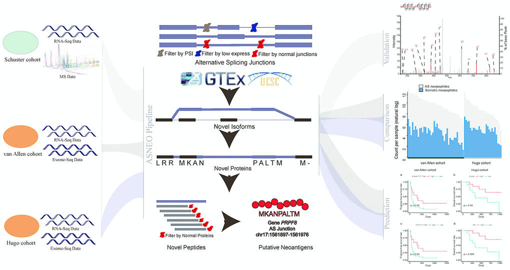 We presented a versatile and comprehensive workflow to analyze AS neopeptides by ASNEO (Figure 1). In our study, three cohorts were used to identify AS neopeptides by ASNEO, which is presented as an integrated computational pipeline for the identification of personalized Alternative Splicing based NEOantigens with RNA-seq. Three main analyses were performed, including evaluation of the performance of ASNEO, immunogenicity comparison of AS neopeptides with somatic neopeptides, and predictability evaluation of response or survival with AS neopeptides.