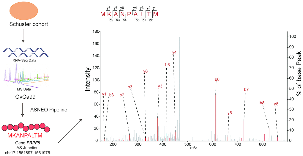 To check the reliability of ASNEO, mass spectrometry analysis was performed on Schuster cohort [14]. ASNEO was applied to RNA-seq data to identify putative AS neopeptides, and only peptides with 9-mer length and percentile %rank<2 were retained. ASNEO identified an average of 69.8 AS neopeptides per sample, range from 6 to 194. The total number of unique neopeptides of all 14 samples was 407, which account for less than half of the number of total neopeptides. Mass spectrometry data was applied to search against the database consisting of Normal Proteins plus the putative AS neopeptides by each sample. To guarantee a high confidence, a 1% false discovery rate was set. As a result, the predicted AS neopeptides MKANPALTM from sample OvCa99 and IHFLSLLNF from sample OvCa48 were experimentally discovered in complex with MHC I via mass spectrometry with a high confidence (Figure 3). The score of MKANPALTM was 1.9e-07 while the score of IHFLSLLNF was 7.31e-07, rank 208/407 and 187/407 relatively. The discovery of peptides existing in both mass spectrometry data and computational predicted AS neopeptides indicating that ASNEO can identify AS neopeptides effectively, which were processed and presented through the MHC I pathway.