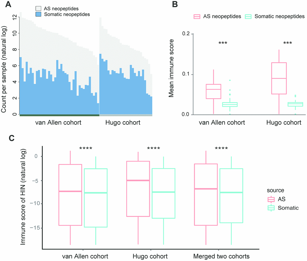 When comparing the scores of AS neopeptides with somatic neopeptides, we found that the scores of AS neopeptides were higher in van Allen cohort (Wilcoxon test, p=4e-11), but not in Hugo cohort (Wilcoxon test, p=0.47). While using the HIN, AS neopeptides had a significant higher immune score than that of somatic neopeptides both in van Allen cohort and in Hugo cohort as well as in merged two cohorts (Wilcoxon test, P<2.2e-16 for all) (Figure 4C), indicating that AS neopeptides might be more immunogenic, could be a better candidate as cancer vaccines.