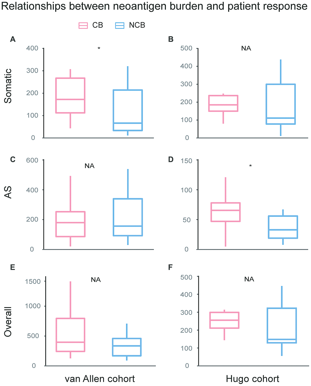 Van Allen cohort and Hugo cohort were classified into two clinical response groups: clinical benefit and no clinical benefit. For van Allen cohort (n=39), response (n=13) samples were regarded as clinical benefit samples, while nonresponse (n=21) samples were regarded as no clinical benefit samples. The long-survival group was ignored. For Hugo cohort (n=25), PD (Progressive Disease, n=13) group was treated as no clinical benefit while PR (Partial Response, n=10) and CR (Complete Response, n=2) groups were treated as clinical benefit. In our study, we used Wilcoxon rank sum test to determine the difference of neoantigen burden between the clinical benefit group and no clinical benefit group.