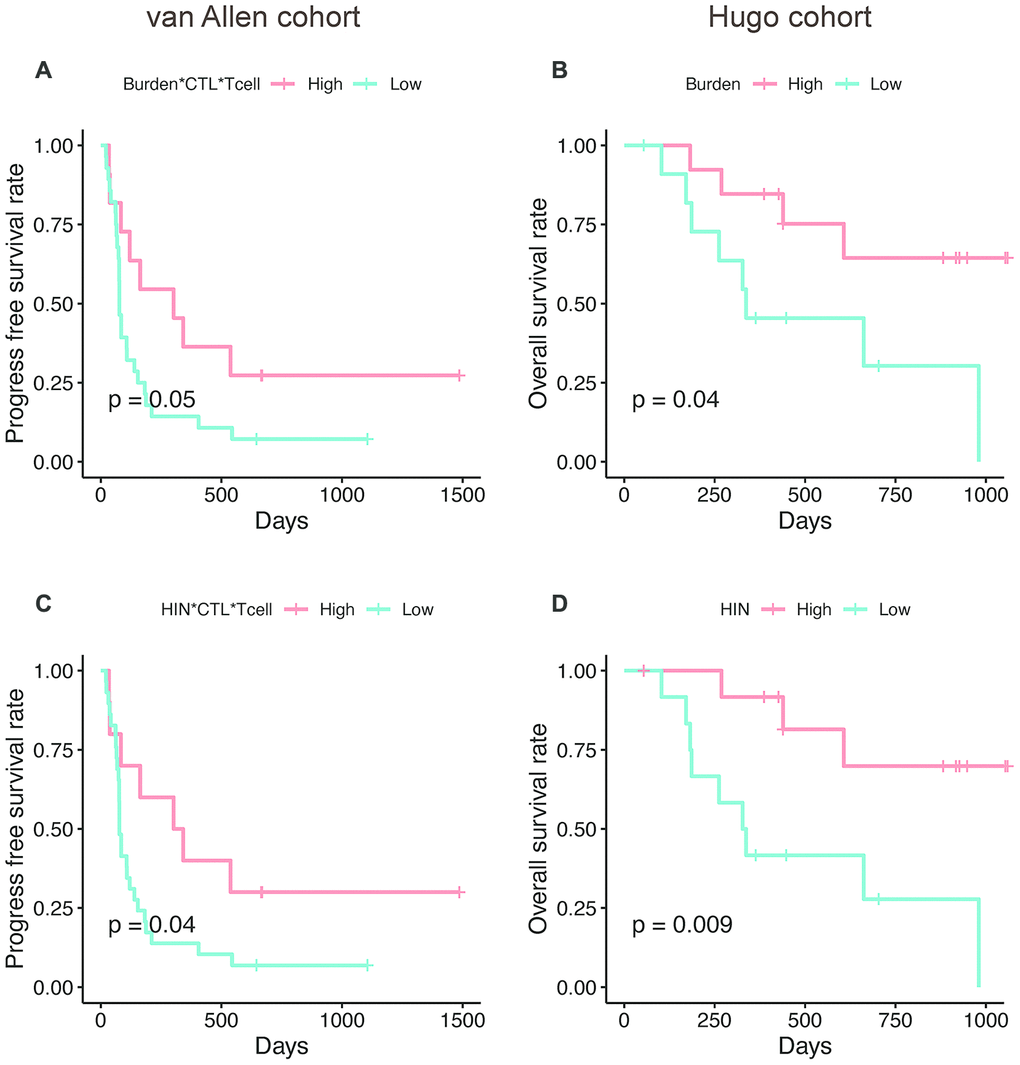 Next, we explored whether the AS neoantigen burden could predict patient survival. We firstly investigated the expression level of TGFB1 in these two cohorts, which is a suppressor of cytotoxic lymphocyte (CTL) [18]. We found that the TGFB1 is highly expressed in Hugo cohort rather than van Allen cohort (Wilcoxon test, P=0.04), which indicated that the tumor microenvironment differences should be considered in these two cohorts. Hence, the AS neoantigen burden multiplying CTL and T cell abundance (Burden*CTL*Tcell) was defined as a metric to predict the patient survival in van Allen cohort while in Hugo cohort only neoantigen burden was considered. Here, we examined whether the expression level of TGFB1, T cell abundance or CTL abundance possess the survival predictive power or not. Our analysis results showed that the abundance of TGFB1, CTL, T cell or CTL*Tcell were not associated with patients' survival neither in van Allen cohort nor in Hugo cohort (log-rank test, P<0.05 for all, Supplementary Figure 1). But the AS neoantigen burden multiplying CTL and T cell abundance was associated with progress free survival (PFS) in van Allen cohort (log-rank P=0.05, Figure 6A) and neoantigen burden was associated with improved overall survival (OS) in Hugo cohort (log-rank P=0.04, Figure 6B). When using the HIN instead of neoantigen burden as a predictor, the survival separations became more significant both in van Allen cohort (HIN*CTL*Tcell, log-rank P=0.04, Figure 6C) and in Hugo cohort (HIN, log-rank P=0.009, Figure 6D), which suggested that the HIN could be a better biomarker. In addition, we examined the metrics (van Allen cohort: Burden*CTL*Tcell, HIN*CTL*Tcell; Hugo cohort: Burden, HIN) together with gender and age in multivariable Cox regression analysis, and the results indicated that all these metrics were associated with the patients' survival, independent of gender and age (Supplementary Table 3).
