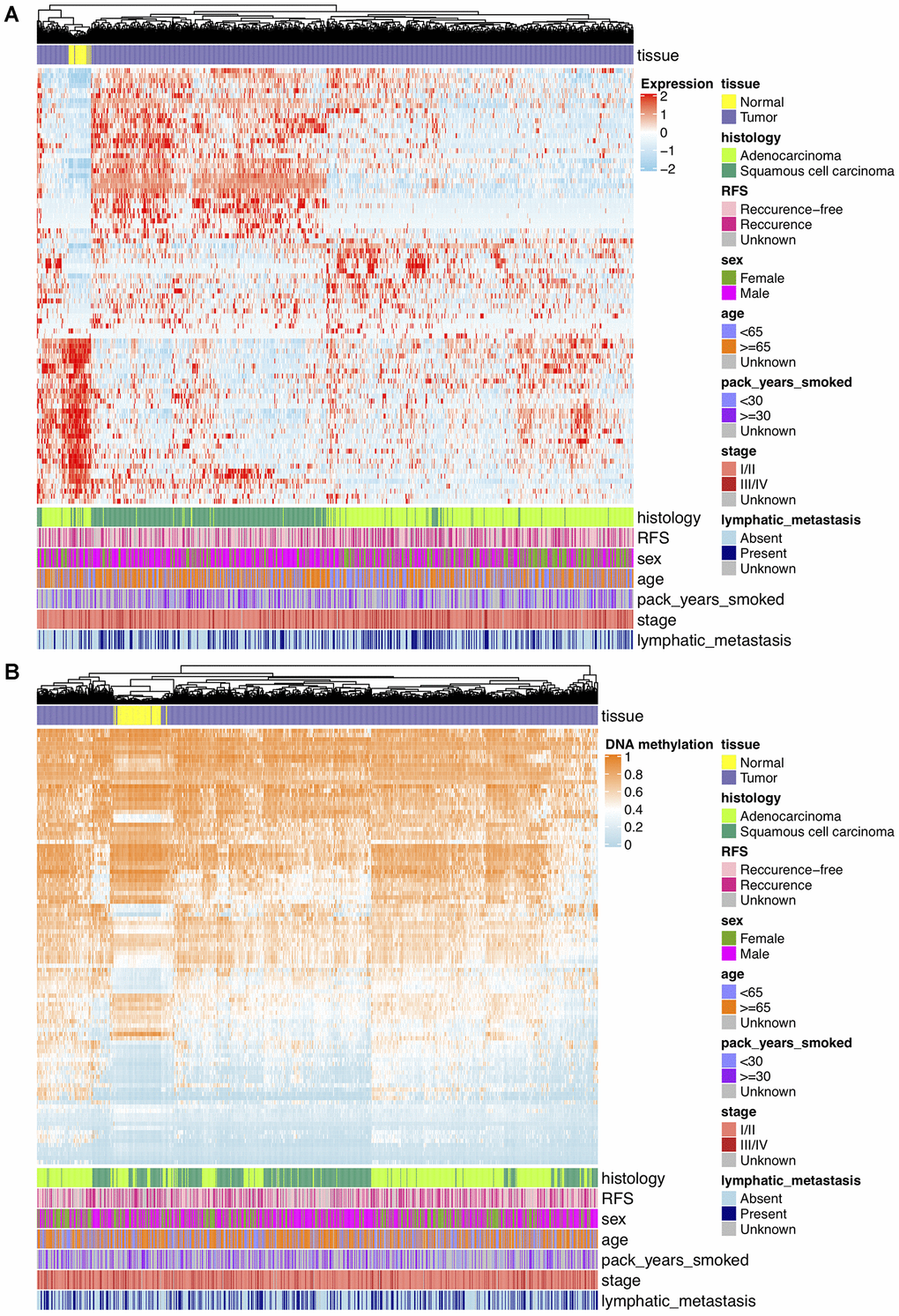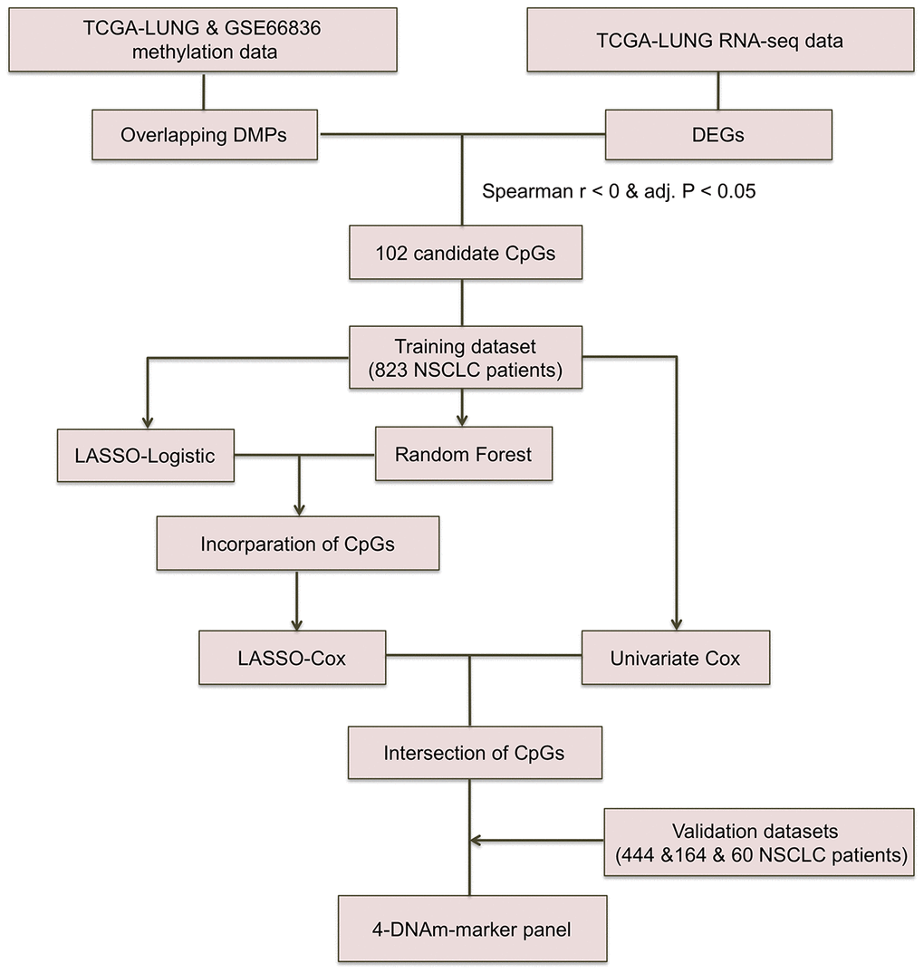 The Cancer Genome Atlas (TCGA) LUNG Cancer, GSE66836, GSE39279 and GSE119144 cohorts included in this study were derived from online public data repository, with NSCLC patients who received neoadjuvant chemotherapy excluded. For DNAm data, a total of 901 TCGA NSCLC samples were available using the Illumina Infinium HumanMethylation450 platform, including 827 tumor tissues and 74 non-tumor tissues. DNAm level 3 data were obtained at the website: https://tcga.xenahubs.net. In addition to TCGA data, we also analyzed GSE66836 dataset (164 LUADs, 19 normal lungs), GSE39279 and GSE119144 cohorts that recruited 444 and 60 NSCLC patients respectively. Three methylation microarray datasets and corresponding clinical data were downloaded from Gene Expression Omnibus (GEO) database. DNAm levels of 4 datasets above were all measured by beta values for each CpG probe, which ranged from 0 (completely unmethylated) to 1 (completely methylated). TCGA LUNG Cancer gene expression data consisted of 1116 samples, including 1007 NSCLC tissues and 109 normal tissues. RNA sequencing (RNA-seq) level 3 expression data (normalized read counts) and related clinical data were available at https://tcga.xenahubs.net. TCGA NSCLC somatic mutation data comprised of somatic variant calls in TCGA-LUAD (n=562) and TCGA-LUSC (n=486) cohorts were retrieved from https://gdc.xenahubs.net.