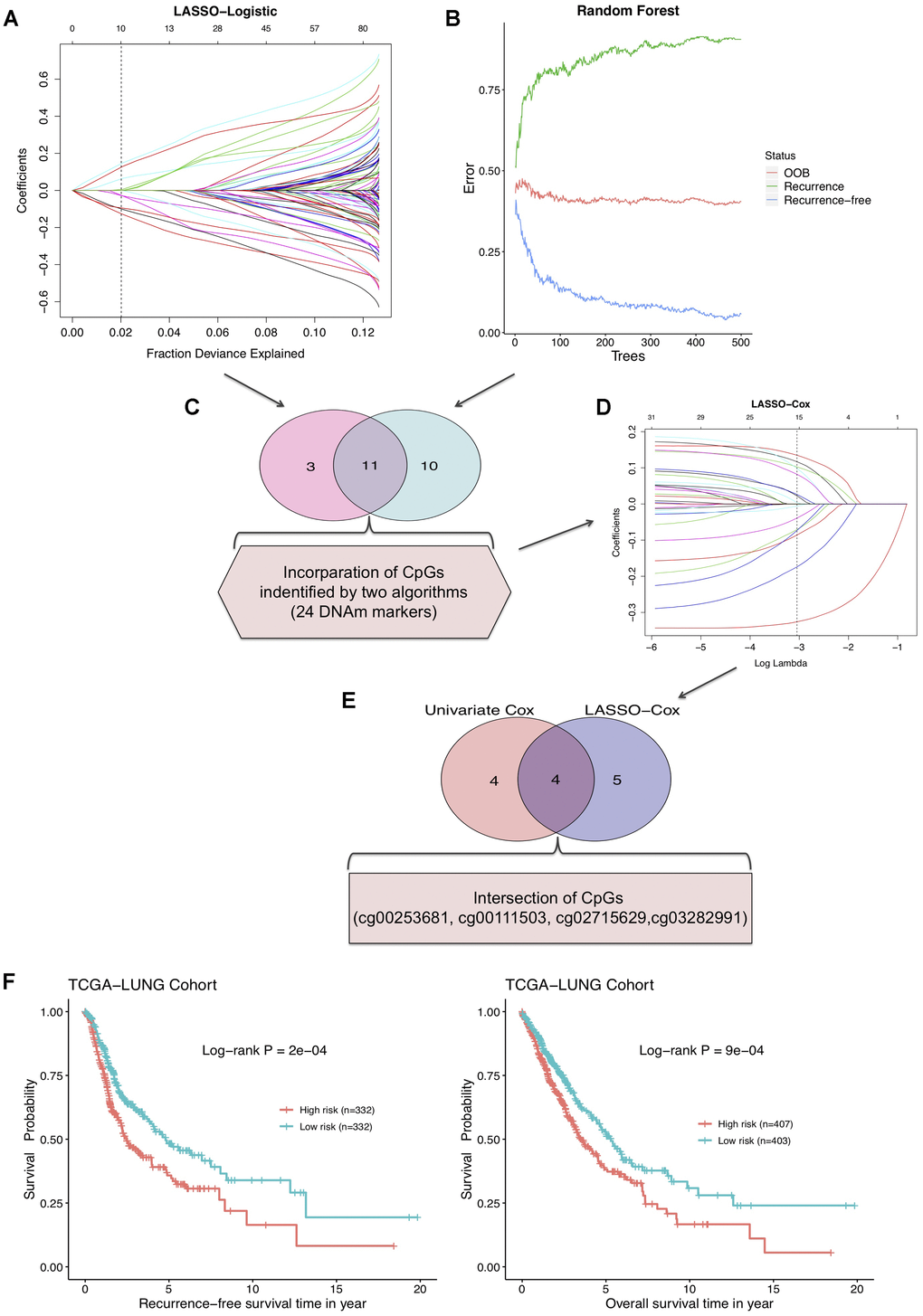 In training phase, TCGA LUNG Cancer cohort was used as the training dataset, in which 664 NSCLC specimens have detailed recurrence-free survival (RFS) information. First, Random Forest and Least Absolute Shrinkage and Selection Operator (LASSO) Logistic models were applied to select recurrence-related DNAm markers. Meanwhile, univariate cox regression was performed to identify CpG markers associated with RFS of NSCLC patients. According to theoretical basis of LASSO method, Cox proportional hazards regression model with LASSO penalty generates regression coefficients that strictly equal to 0, removing some of variables with lower weights on the purpose of data dimension reduction, and preventing overfitting resulting from collinearity of the covariates [52]. To further identify more significant markers, LASSO-Cox method was subsequently implemented on the incorporation of CpGs selected by LASSO-Logistic and Random Forest algorithms. Next, the consistent CpGs identified by univariate Cox and LASSO-Cox methods were retained and then incorporated into a multivariable Cox regression model. Eventually, GSE39279, GSE66836 and GSE119144 were taken as validation datasets, in which GSE119144 cohort was consisted of 60 NSCLC patients who underwent anti-PD-1/PD-L1 ICBs treatments, with complete follow-up information available about 59 samples.