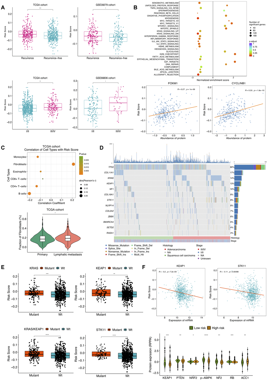 Subsequently, we linked the DNAm signature to mutations in genes. Based on mutation profiles of TCGA NSCLC tumors, several SMGs identified by MutsigCV v.1.41 and also correlated with DNAm-based risk score were presented in Figure 4D. A notable correlation of our risk score with somatic mutations in gene KRAS, KEAP1, STK11, and co-occurring KRAS/KEP1A mutations was found in NSCLC (Figure 4E). Furthermore, we found a significant association of this DNAm signature with mRNA expression of KEP1A and STK11 (Figure 4F). Higher NRF2, ACC1 and lower KEAP1, PTEN, p-AMPK, NF2 and RB protein abundance were observed in high-risk group (Figure 4F). Loss-of-function type mutation in KEAP1 results in activation of NRF2, which accelerates lung cancer cell growth [23]. Combined loss of PTEN and KEAP1 promotes LUAD formation in mice model [24]. In current study, high DNAm-based risk score was connected to low expression of STK11, low AMPK activation as well as STK11 mutation, indicating the mTOR activation of TCGA NSCLC samples in high-risk group [25]. Elevated ACC1 levels in patients with hepatocellular carcinoma were correlated to vascular invasion and disease recurrence [26]. The inactivation of NF2 in malignant Pleural Mesothelioma with mTOR activity aberrantly upregulated, fails to inhibit cell proliferation, leading to a poor prognosis [27]. Absence of RB in a mouse model of LUAD was demonstrated to drive disease progression and metastasis [28].