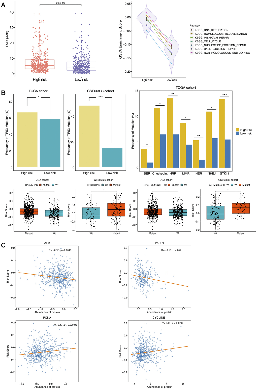 The related gene signatures involved in six of aforementioned DDR pathways were listed in Table 2 and defined as BER, NER, HRR, MMR, NHEJ and Checkpoint genes [33], respectively. Also, six kinds of co-mutations in DDR genes above were analyzed in this study. It has been well-established that TP53 mutation accelerates cell cycle and DNA replication, and TP53/KRAS co-mutation exhibits a remarkable increased mutational loads and owns a potential of predicting response to immunotherapy in LUAD [34]. In this study, higher frequency of TP53 mutation in high-risk group was observed in patients from TCGA NSCLC as well as GSE66836 cohort (Figure 5B), indicating NSCLC tumors with higher risk score were more susceptible to yielding DNA replication errors. Additionally, the presence of TP53 alterations without EGFR or STK11 mutations is revealed to identify LUAD patients who respond to anti-PD1 therapies [35]. Significant associations of risk scores with TP53/KRAS co-mutation, combination of TP53-Mut/EGFR-Wt mutation as well as somatic mutations in STK11 and in other co-analyzed DDR genes were also identified in this study (Figure 5B). The mTORC1-S6K pathway is aberrantly activated due to STK11 loss, leading to DNA damage response defects and prompting genome instability [36]. The mutated ATM is reported to correlate with genomic instability and ATM predominantly responds to DNA double-strand breaks (DSB) [37, 38]. What’s more, we found significant associations of the DNAm signature with waning protein abundance of ATM, PARP1, and raised expression of PCNA and CYCLINE1 protein (Figure 5C). Overexpressed CCNE1, an oncogene encoding cell cycle protein CYCLINE, induced DNA replication stress by premature S phase entry, leading to genomic instability [39]. All analyses above suggested that changes of DNAm patterns in NSCLC might predispose epigenetically impacting on TMB by mediating alteration in cell-cycle regulating and DDR genes, resulting in more neoantigens formation and changes of the tumor antigenicity.