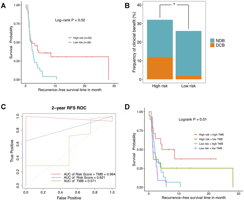 To go further, the relevance of DNAm-based risk score with response to ICBs was investigated on GSE119144 cohort. We observed RFS of immunotherapeutic patients in high-risk group was significantly superior to that of those in low-risk group (Figure 6A). Besides, a greater percentage of NSCLC patients with high risk score owned a durable clinical benefit, while most of low-risk group patients had no durable clinical benefit (Figure 6B). Notably, the combination of DNAm signature and TMB saliently improved the ability to predict clinical responses to immunotherapy (AUC = 0.965, Figure 6C). As was revealed in Kaplan–Meier curves, NSCLC patients separated by this combination of two variables harbored significantly different clinical outcomes (P = 0.01, Figure 6D). These results implicated high risk score and high mutational burden might represent robust biomarkers to determine best responders to ICBs treatments. And anyway, the clinical application effect deserves further research and being corroborated in larger cohorts with longer follow-up data.