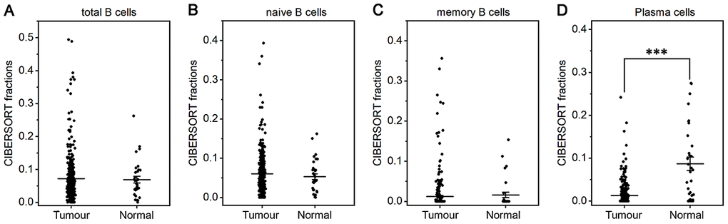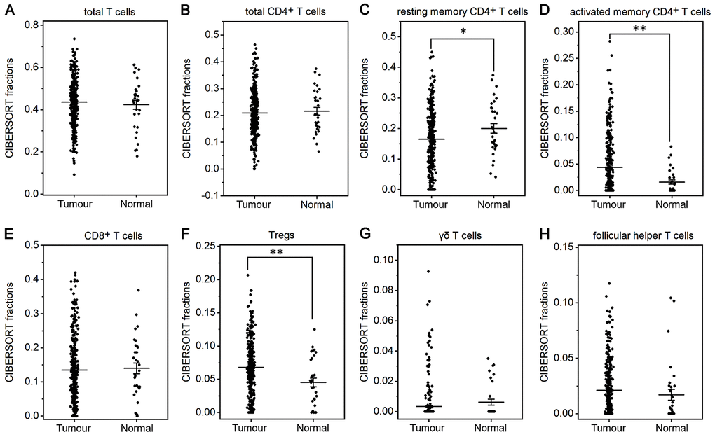 The fraction of plasma cells was lower in gastric cancer than in normal tissue (P< 0.001, Figure 1D), but there were no significant differences in the fractions of total B cells, naive and memory B cells (Figure 1A–1C). These results suggest that the ability of B cells to differentiate into plasma cells is inhibited in gastric cancer, which may affect antitumor immunity. For T cell subpopulations, the fractions of activated memory CD4+ T cells and Tregs increased in gastric cancer compared with normal tissue (P<0.01, Figure 2D, 2F), while the resting memory CD4+ T cell fraction decreased in gastric cancer tissue (P<0.05, Figure 2C). However, the proportions of total T cells, CD4+ T cells, CD8+ T cells, δγ T cells and follicular helper T (Tfh) cells showed no great changes (Figure 2A, 2B, 2E, 2G, 2H). Thus, it is unlikely that a T cell-mediated antitumor immune response occurs in gastric cancer patients.