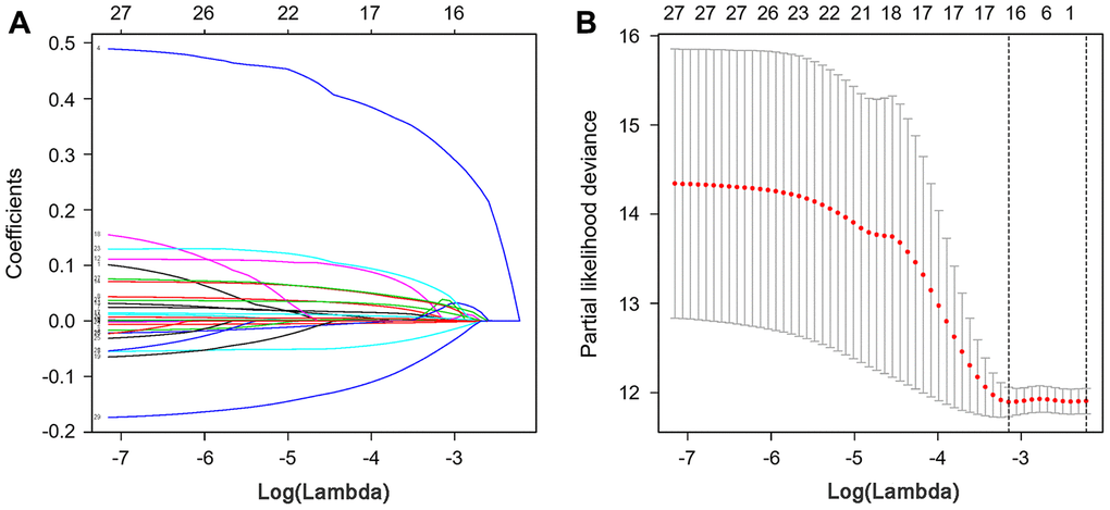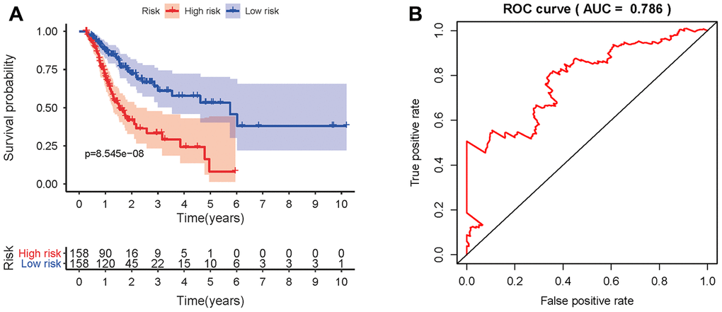 To develop a prognostic indicator for the prediction of survival outcomes, LASSO Cox regression analysis was carried out, and ten hub IRGs were screened to construct a prognostic signature (Figure 10). Kaplan-Meier plots indicated that the prognostic signature could predict the survival probability of gastric cancer patients (Figure 11A). The area under the receiver operating characteristic (ROC) curve was 0.786, indicating the moderate potential for survival prediction (Figure 11B). Further validation illustrated that the constructed prognostic model could separate the survival status of gastric cancer patients into high- and low-risk groups (Figure 12). The formula was as follows: [Expression level of CXCL3 * (-0.0067)] + [Expression level of NOX4 * 0.5146] + [Expression level of AEN * (-0.0610)] + [Expression level of CCL15 * 0.0420] + [Expression level of CCL21 * 0.0012] + [Expression level of FAM19A4 * 0.1248] + [Expression level of RNASE2 * 0.0183] + [Expression level of IGHD2.15 * 0.0956] + [Expression level of NMB * 0.0432] + [Expression level of TRAJ19 * (-0.1860)].