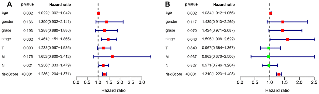 To verify whether the constructed prognostic signature could function as an independent predictor, univariate and multivariate Cox regression analyses were carried out and compared. The results showed that the prognostic signature was an independent predictor of the prognosis of gastric cancer patients after other parameters were adjusted, including age, sex, tumor grade and TNM stage (Figure 13).